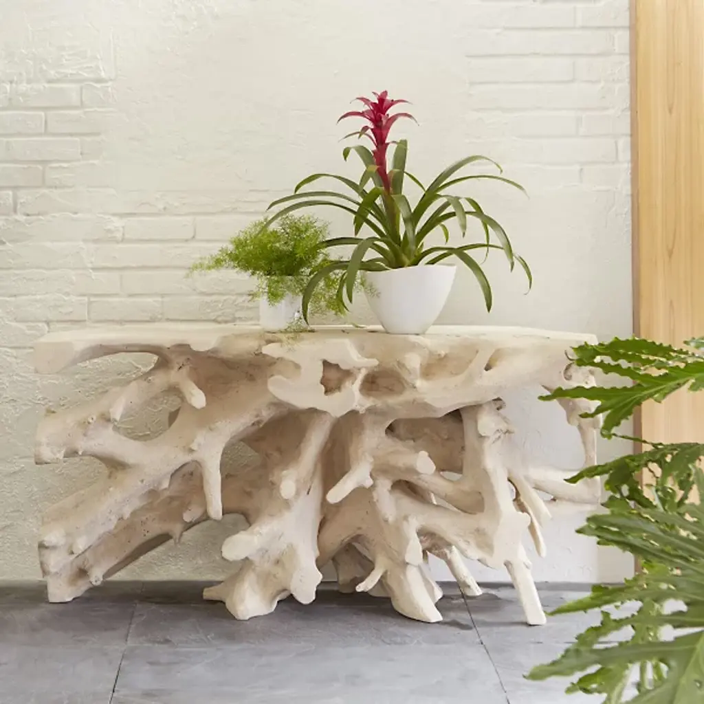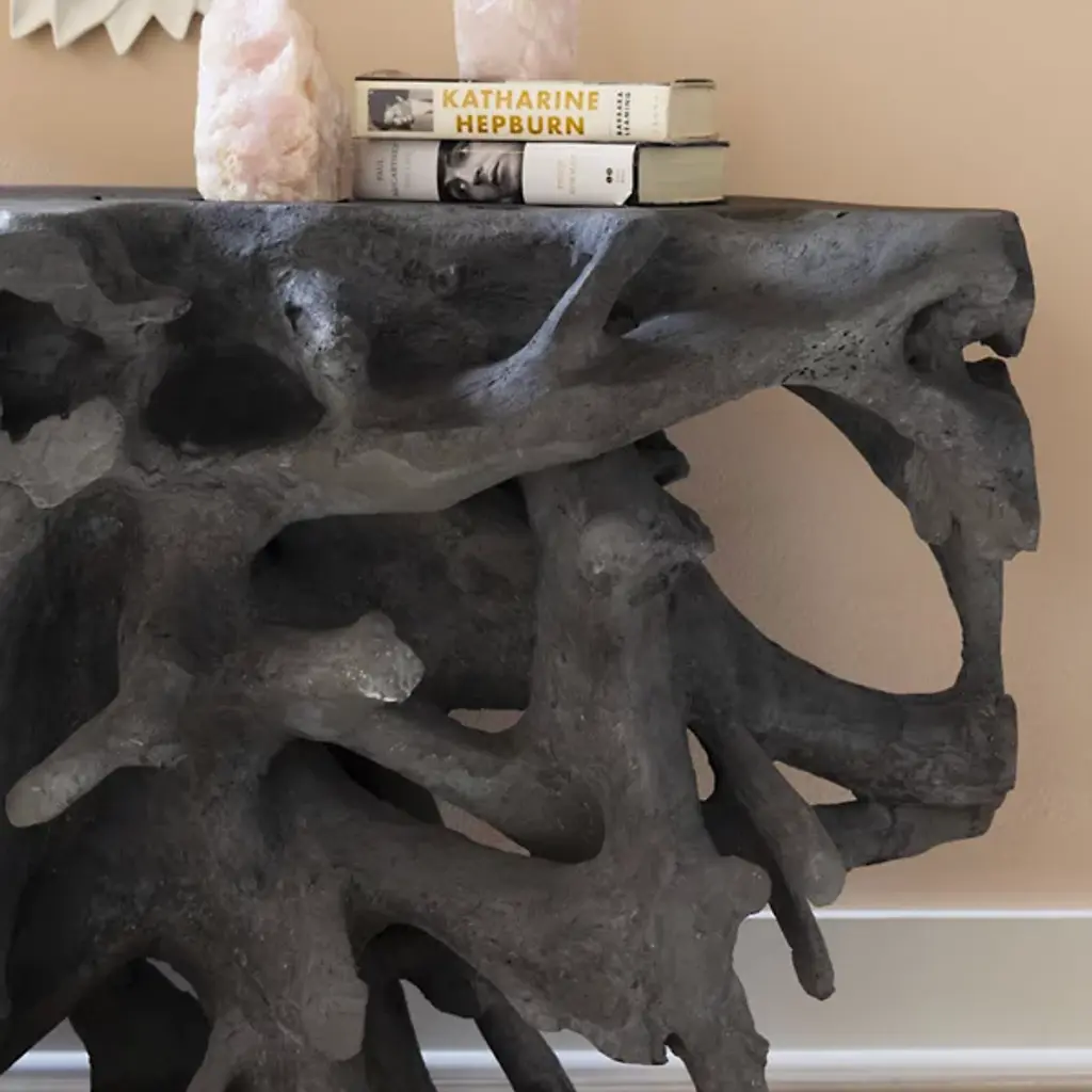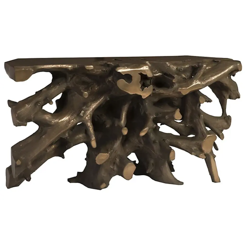 The Beau Cast Root Console Table from Phillips Collection masterfully reimagines the artistry of nature through innovative design. Crafted from composite resin and finished with genuine bronze powder, this striking piece captures the organic beauty of weathered wood roots in an enduring form. The contemporary interpretation maintains all the character of natural driftwood while offering superior durability and a flat plateau top ideal for accessories. Perfect for indoor or outdoor spaces, the bronze finish naturally develops a sophisticated green patina over time if left outside, telling its own story of evolving elegance.
