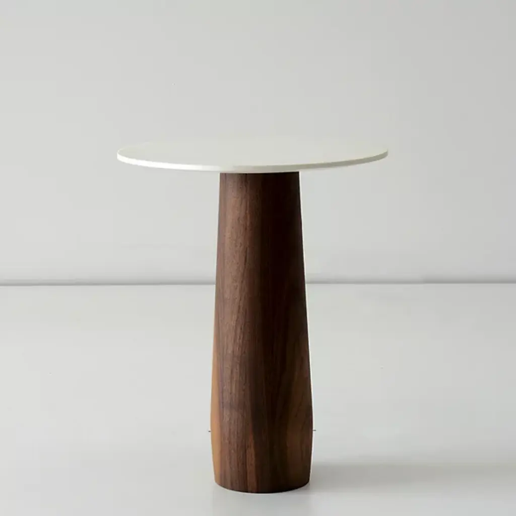 Whimsical in nature, the Bedford Large Side Table is a charming sidekick for the modern living room. The table is handmade in North America and features a round table top supported by a pedestal base. The table top is made from white Corian, a non-porous, stain resistant, and heat-resistant up to 212ºF (100ºC). On the other hand, the table legs are made from solid walnut or solid white oak. The Bedford Large Side Table is available in multiple finishes and also as a Smaller Side Table.