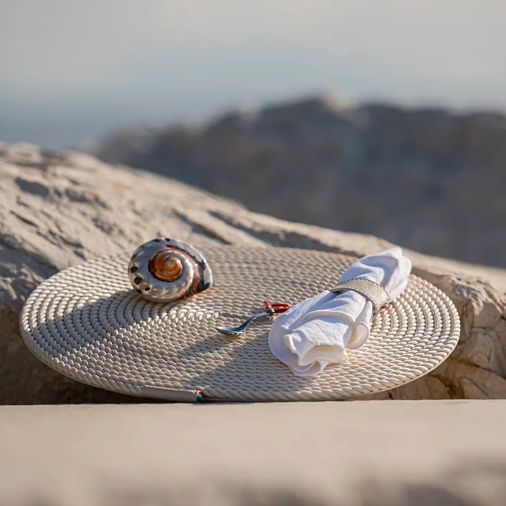 A tightly coiled beige rope with extremities accented by brown faux leather details reveals the unmistakably nautical style of this table mat. Designed for a stylish complementing of tables on boats or refined coastal homes, its design results captivating in its simplicity. Different monochromatic variants and two-tone options are available in the Artemest catalog.
