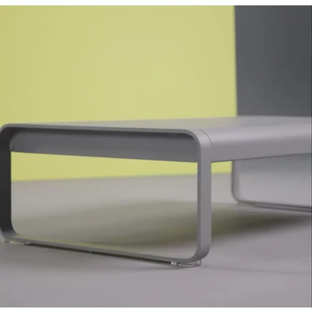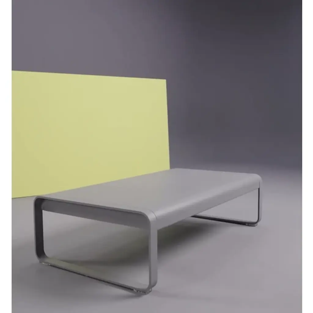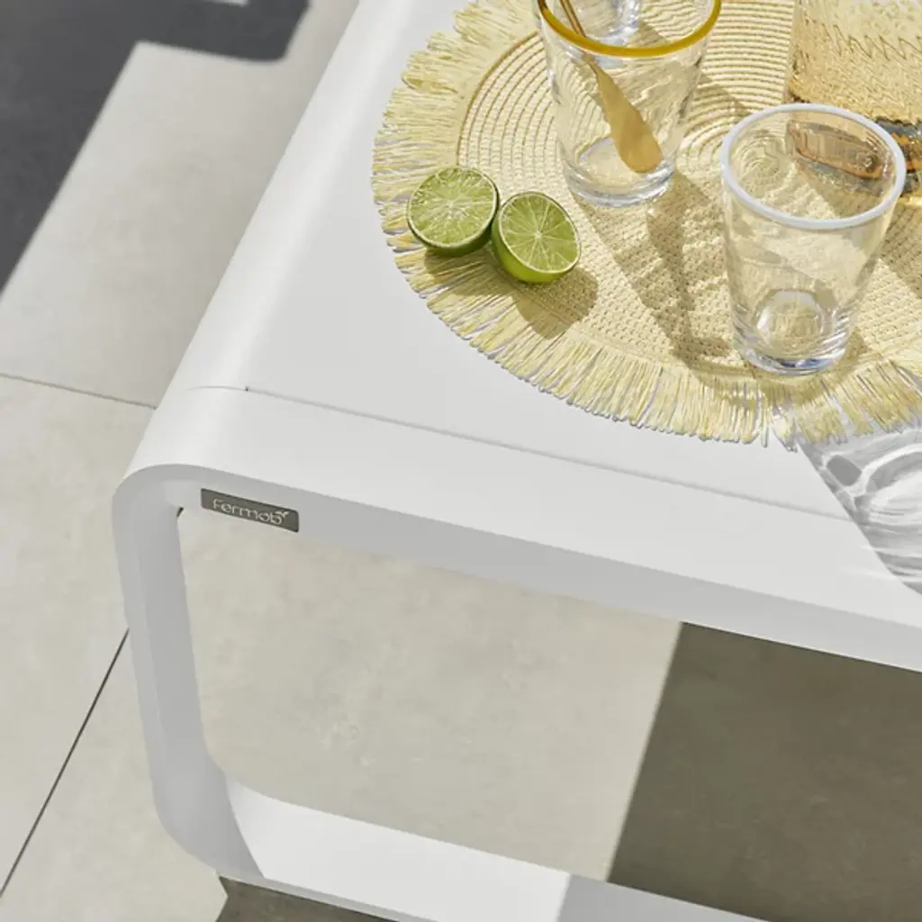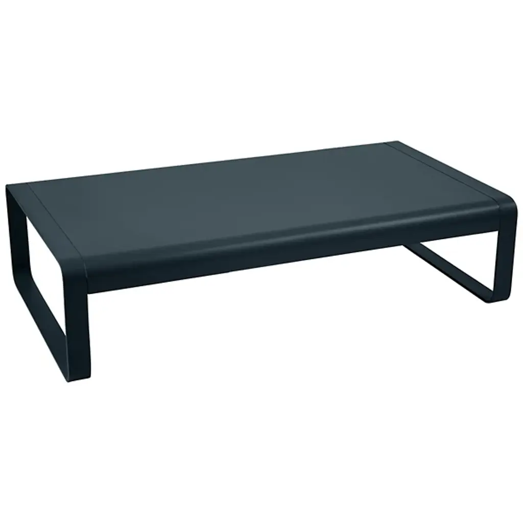 The Bellevie Large Low Table by Fermob puts a modern spin on the tray-like table. It features a sleek appearance and rounded edges, ideal for homes with small children. With a minimal and elegant silhouette, this low table is a staple piece for modern interiors. The tabletop is made from a solid steel sheet, and the base is made from flat aluminum. Each leg comes with foot pads to prevent scraping on the floor.
