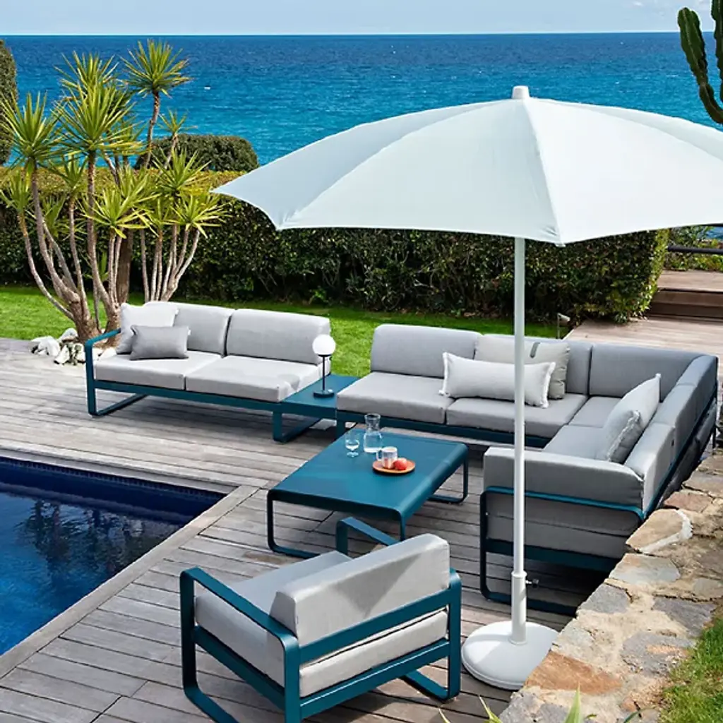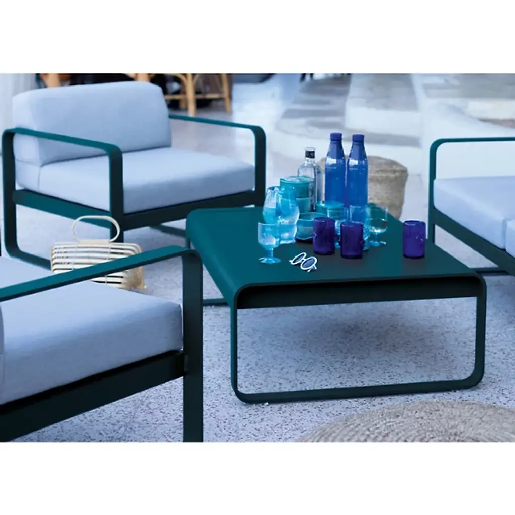 The smooth beauty of Bellevie, ready for lounging. The Fermob Bellevie Low Table is made entirely out of aluminum, a lightweight yet exceptionally durable material that is made even more so with an anti-UV powder coat finish. More than 20 color options are available to give your outdoor (or indoor) lounge space vibrant pop as well as style.