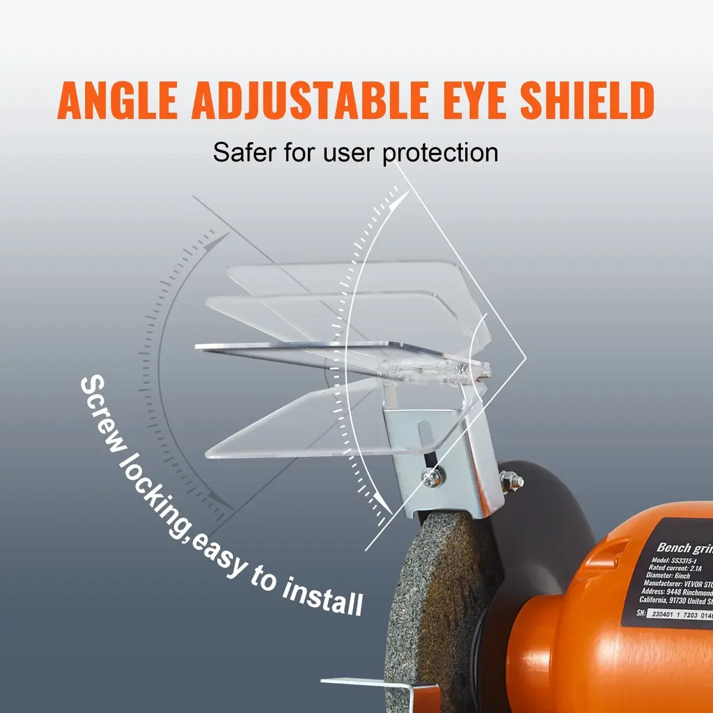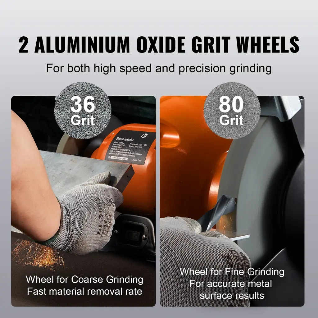 Powerful Grinding: Our 6 inch bench grinder is equipped with a 2.1 A brushless motor that runs at 3550 rpm, provides more grinding power, quieter operation and greater durability than ordinary motors, idea grinding tool for caring and repairing metal implements of all kinds from grinding to reshaping to sharpening. Efficient Grinding Wheel: Features 2 grinding wheels: a 36-grit aluminum oxide wheel for high-speed material removal, and an 80-grit aluminum oxide wheel for fine and precision grinding results. Sharpens knives, chisels, lawnmower blades, axes, shears and more with ease. Easy to Use & Assemble: Our table grinder features pivoting tool rests and adjustable eye guards, different cutting angles can be easily adjusted according to different tools, and eye guards help you stay safe ; It only takes a few minutes to quickly assemble. Less Vibration: Weighs up to 22 lbs, the thick steel base and motor housing of the 6-inch bench grinder provide durability and less vibration during grinding operation of your DIY projects. Wide Applications: From grinding to reshaping to sharpening, the bench grinder is perfect for maintaining and repairing metal tools of all kinds, sharpening knives, chisels, lawnmower blades, axes, shears for DIYers and mechanics. Package Content 2 x Eye Shields & Bolts 2 x Tool Rests & Bolts 1 x 80-Grit Aluminum Oxide Wheel 1 x 36-Grit Aluminum Oxide Wheel