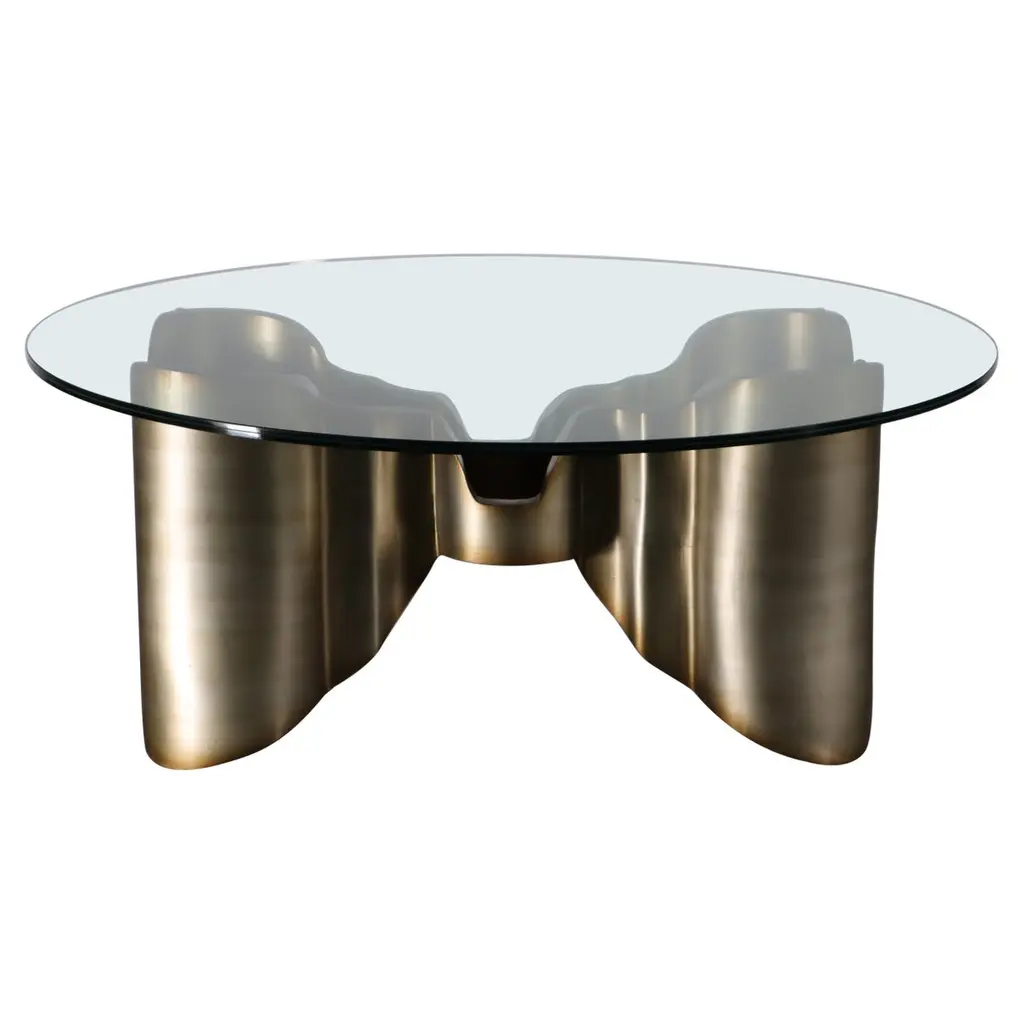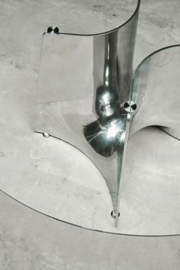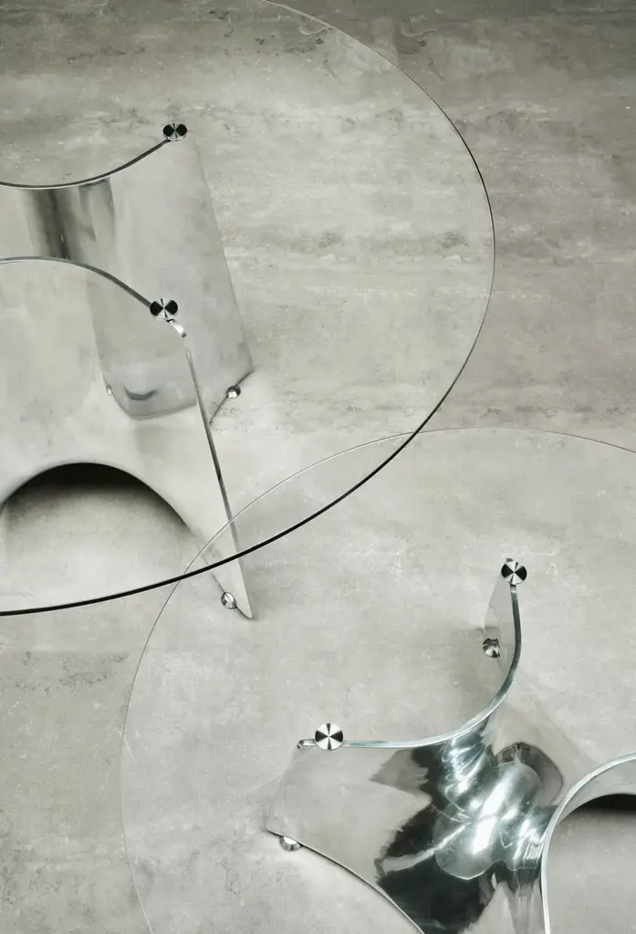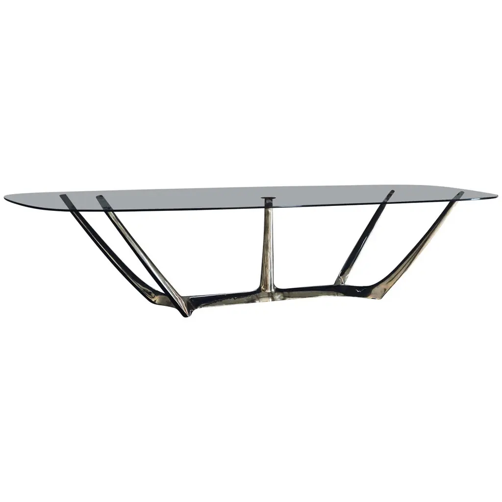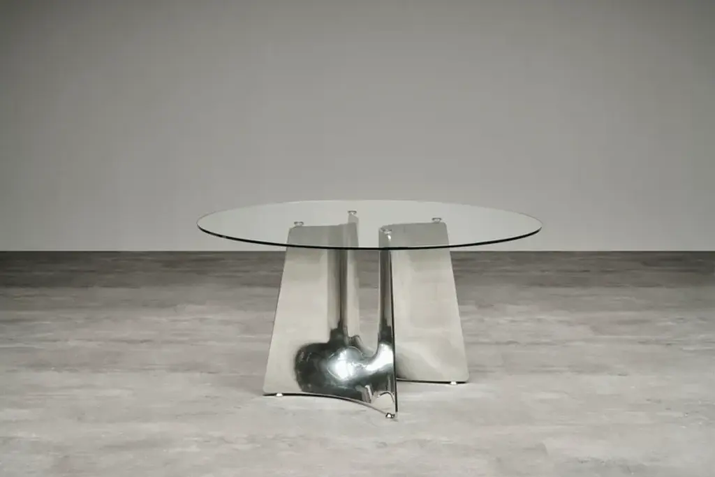 The form of the Bentz table base derives from a simple profile swept along a down and up trajectory. In doing so, it creates an airy and sculptural central focus with the functional characteristics of a column base. The resulting surface and volume seeks hierarchy and interplay between the actual legs of the people seated across from one another. The applied reflection and colour draw in and on the environment to further establish an object with placement, rather than the placement of an object.Table with base structure in aluminium sand-casting and tempered glass tops. The base is available in polished aluminium.