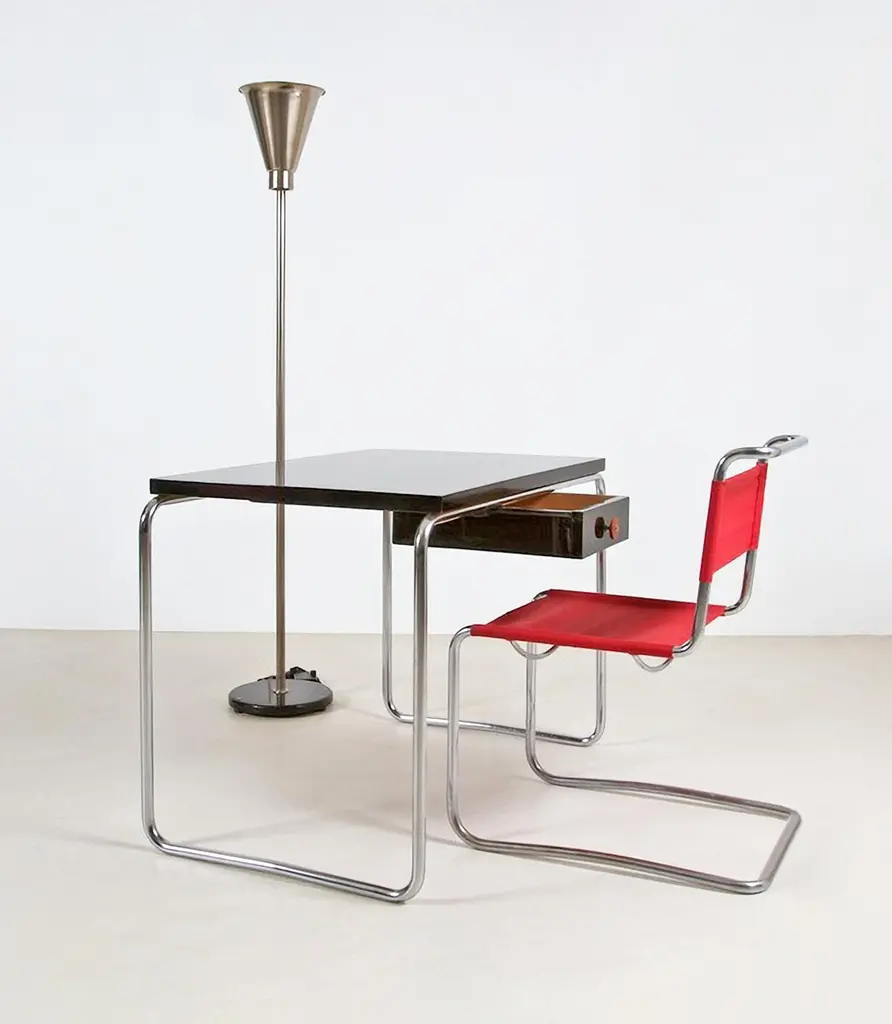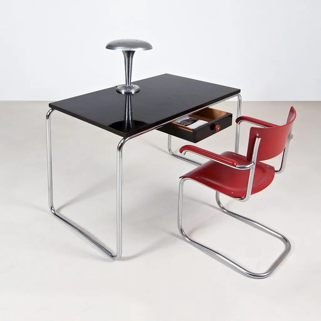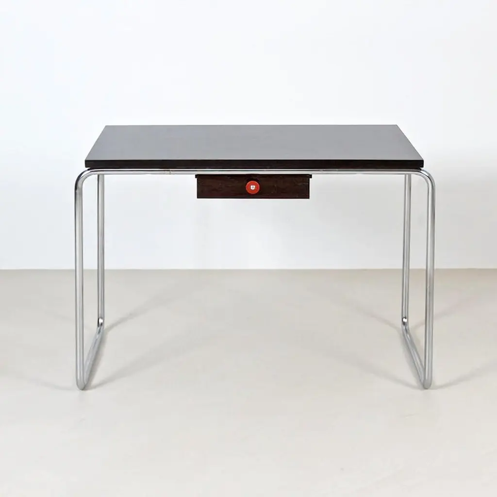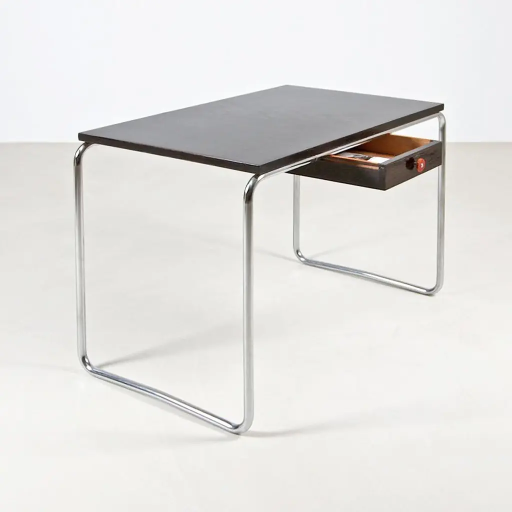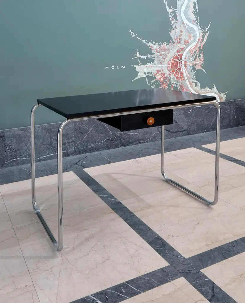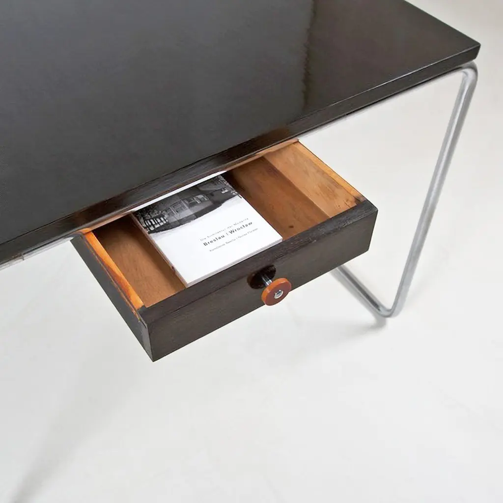 Bespoke modernist tubular writing table made of chrome plated tubular steel and lacquered wood.