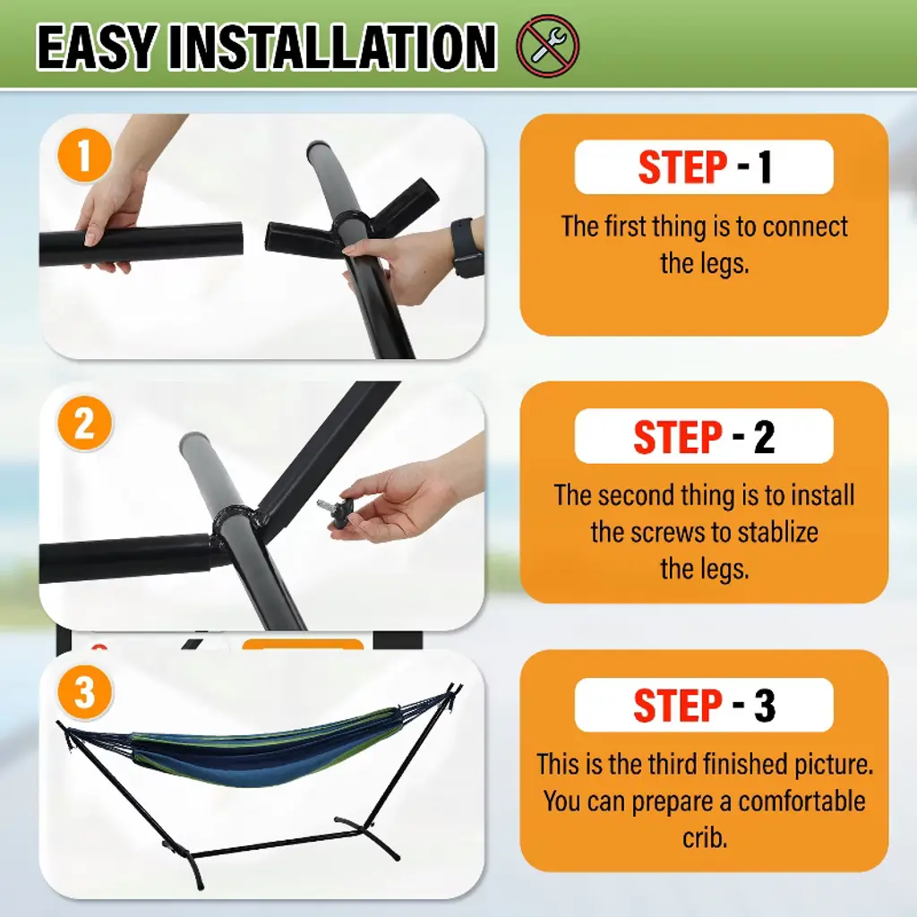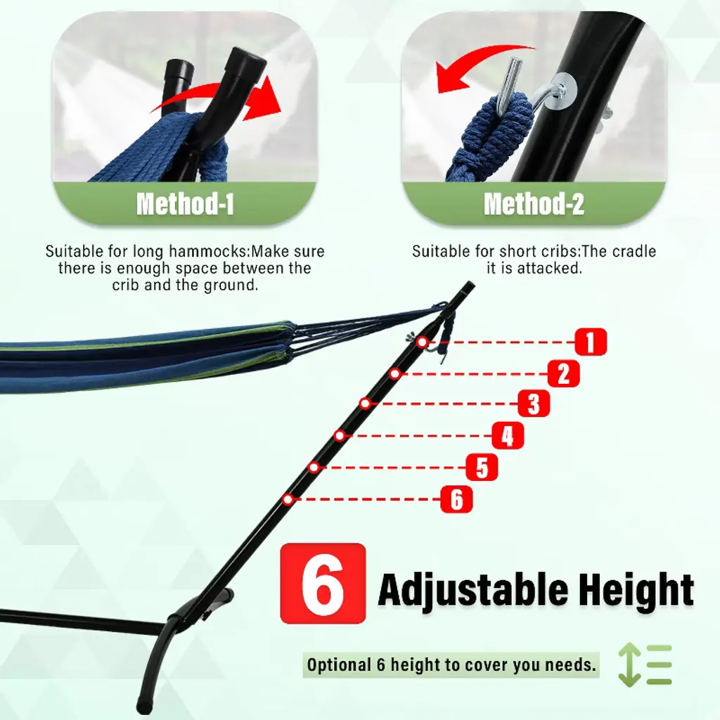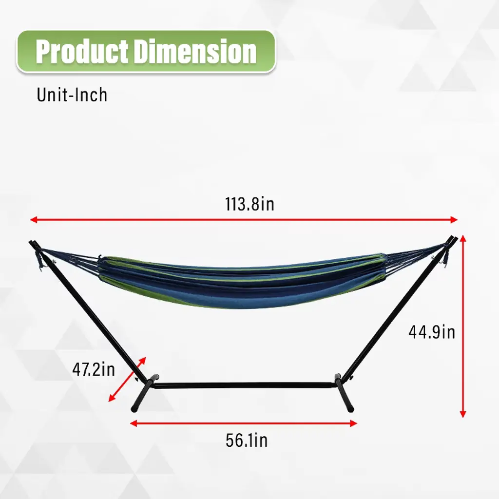 BestMassage Hammock Stand is a portable hammock stand designed for outdoor relaxation, camping, or indoor use. Its sturdy powder-coated steel construction and adjustable height settings ensure stability and adaptability. The spacious hammock, designed for two, offers ultimate relaxation. Easy to assemble and disassemble, it's perfect for travelers or those who enjoy lounging in nature. This versatile stand is perfect for creating an outdoor oasis.