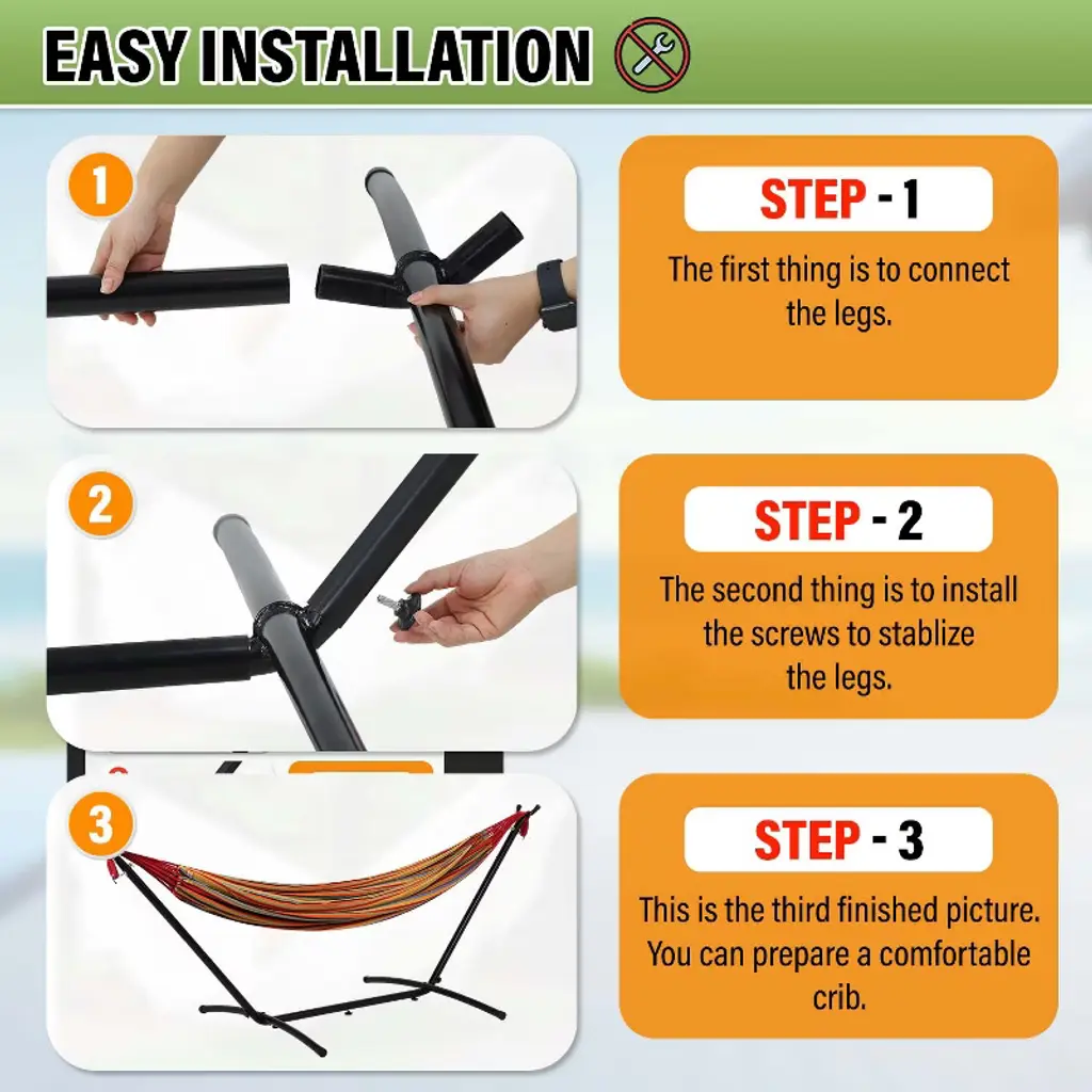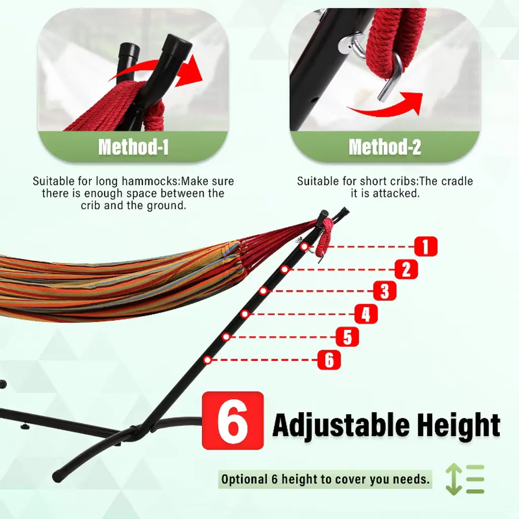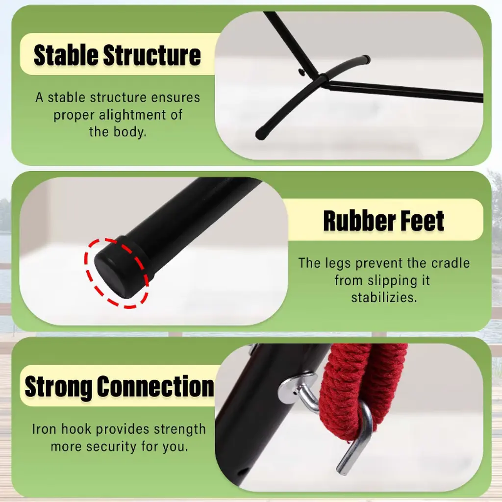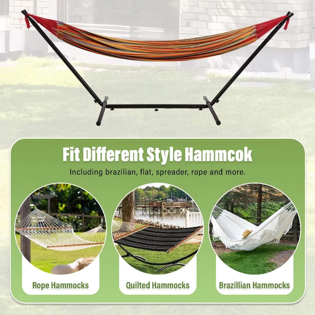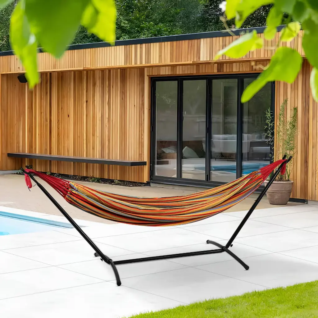BestMassage Hammock Stand is a portable hammock stand designed for outdoor relaxation, camping, or indoor use. Its sturdy powder-coated steel construction and adjustable height settings ensure stability and adaptability. The spacious hammock, designed for two, offers ultimate relaxation. Easy to assemble and disassemble, it's perfect for travelers or those who enjoy lounging in nature. This versatile stand is perfect for creating an outdoor oasis.