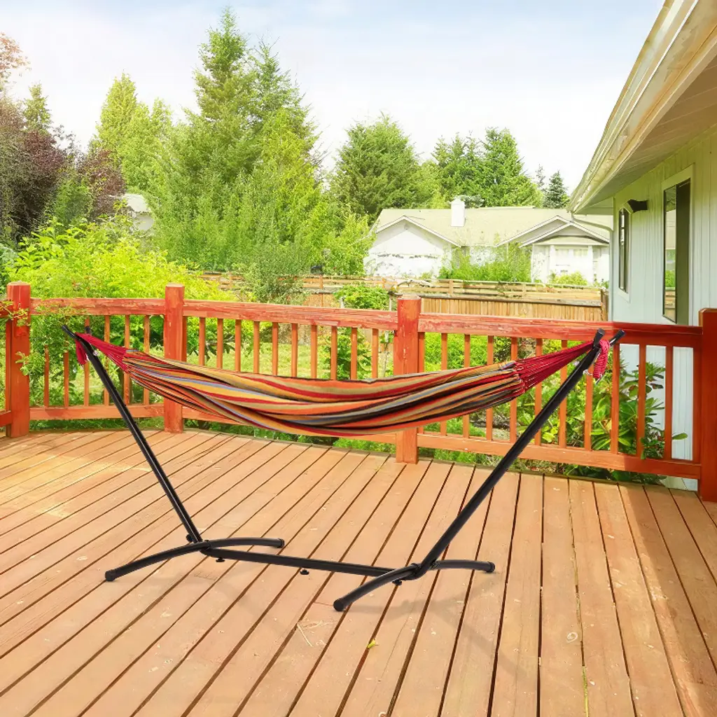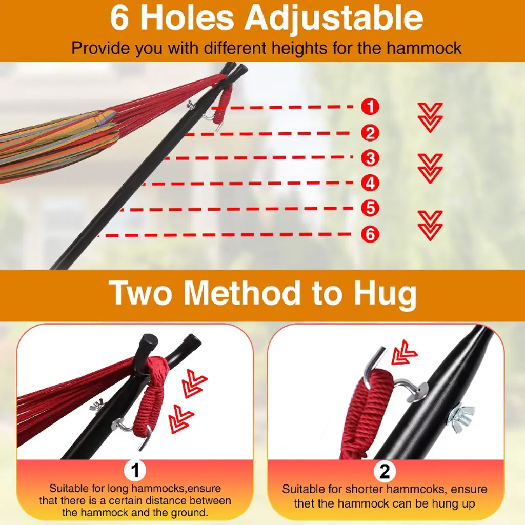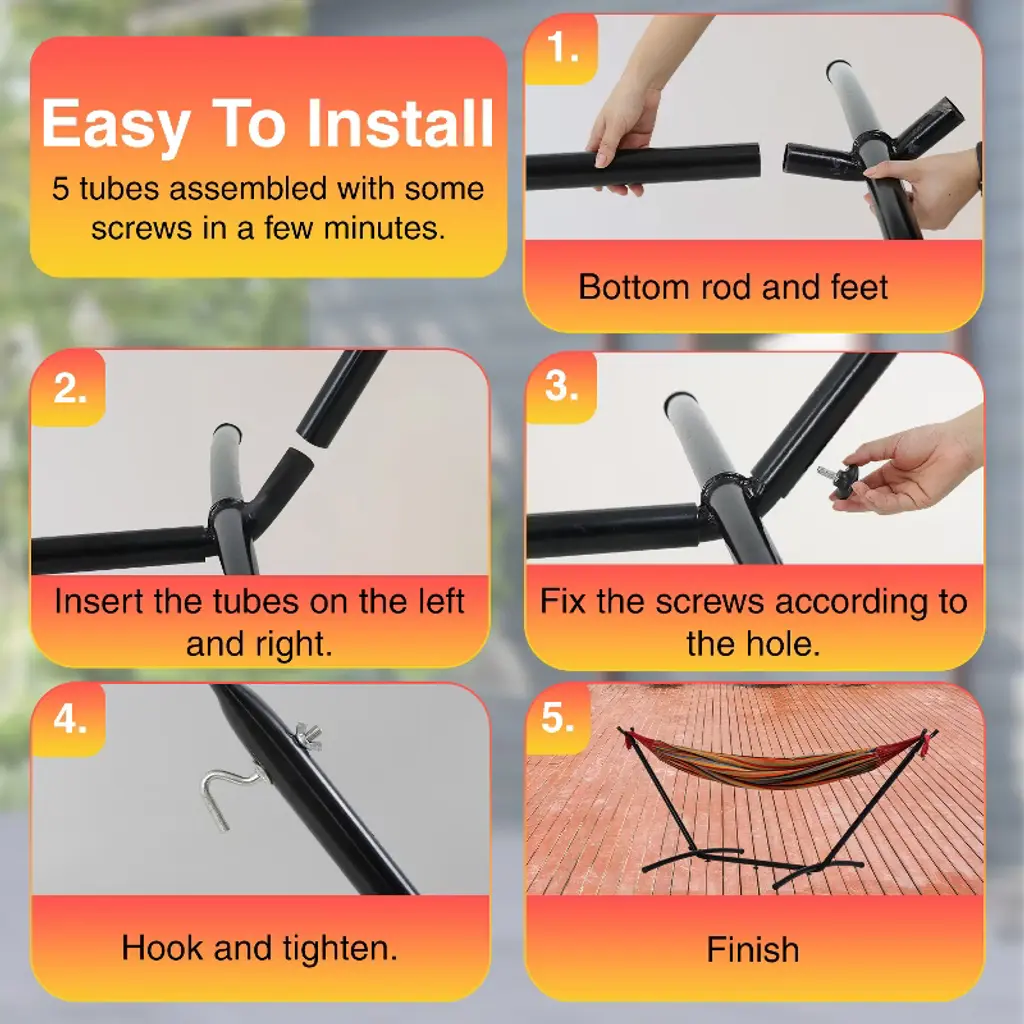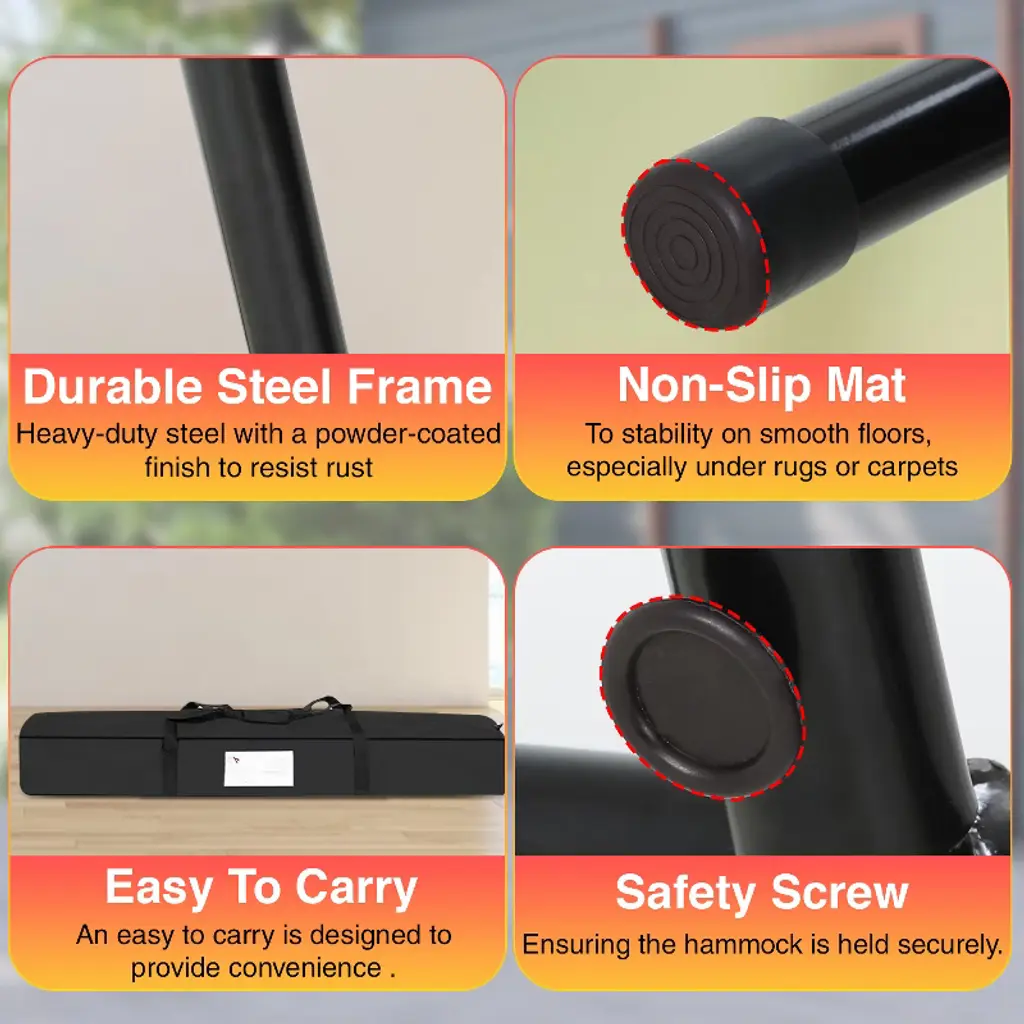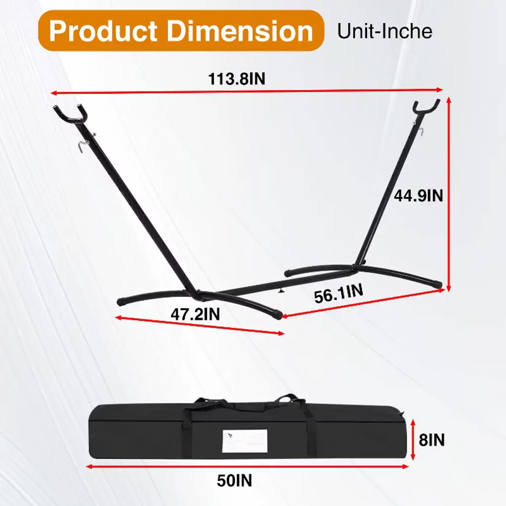 BestMassage Heavy-Duty Steel Hammock Stand offers both quality and luxury, assembling in minutes without tools for ultimate convenience. Designed for durability, it supports up to 400 lbs and is perfect for outdoor camping, beach trips, or indoor relaxation. Lightweight and portable, it includes a nylon carrying bag for easy storage and transport. Enjoy a reliable, long-lasting stand that provides the perfect spot to unwind and release stress. Note: Hammock not included.