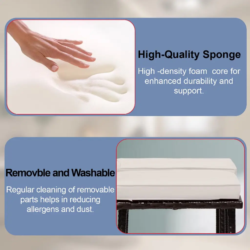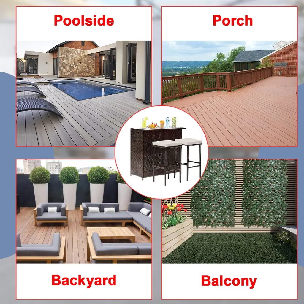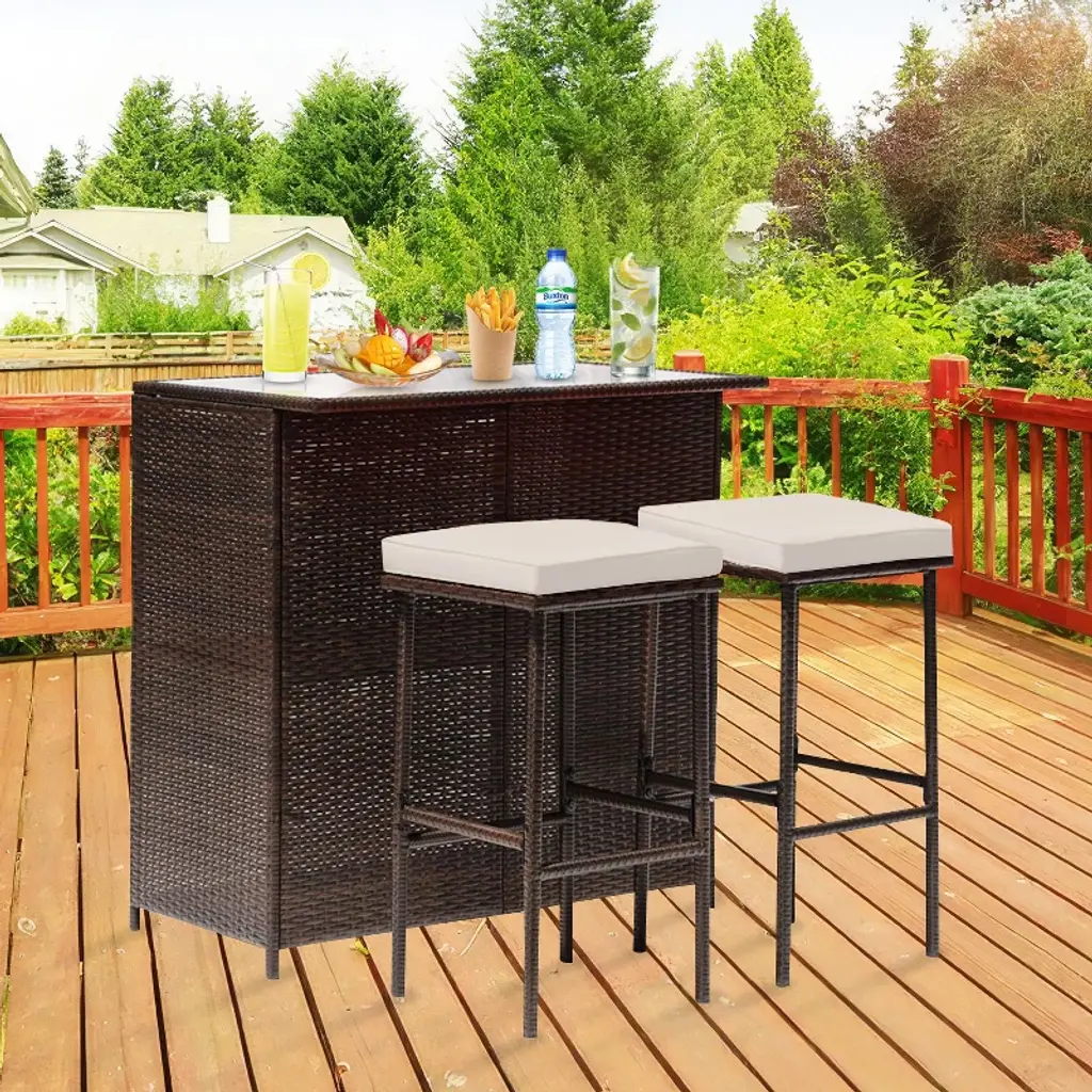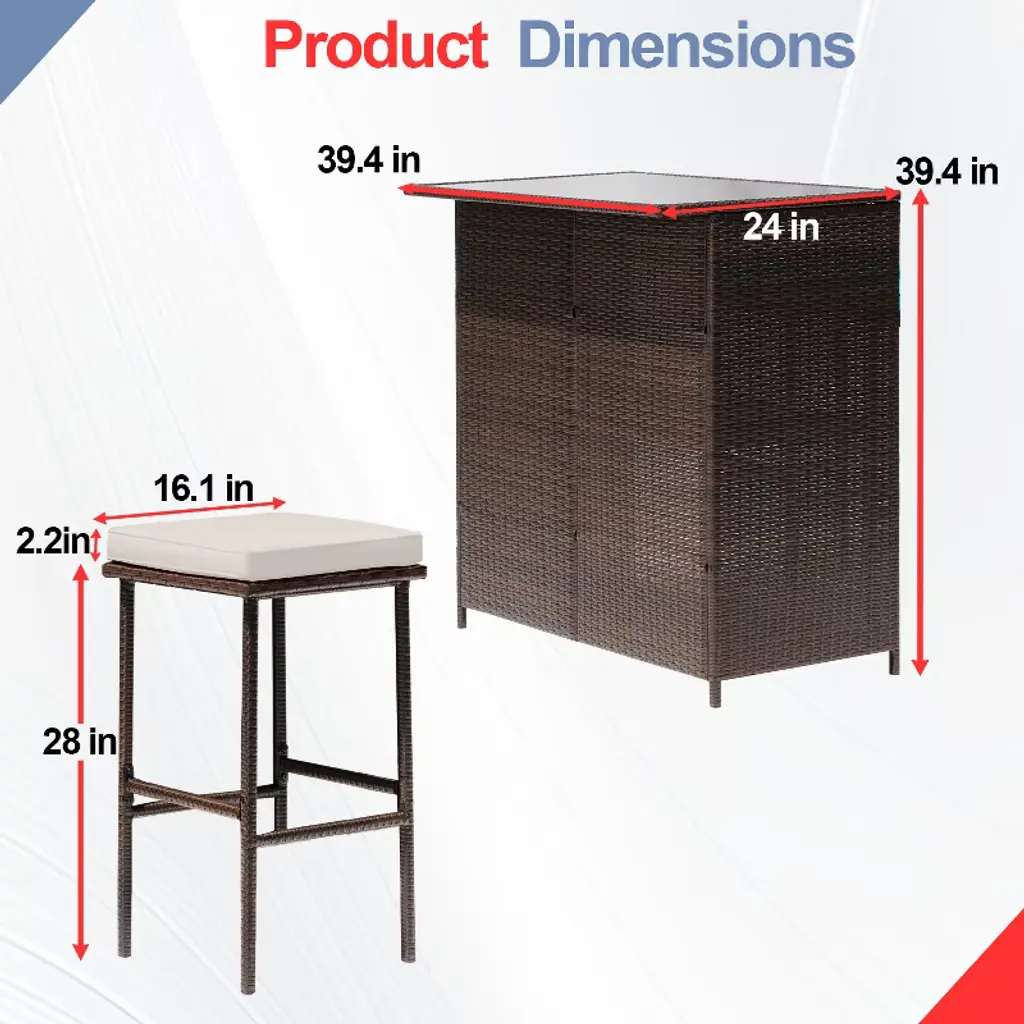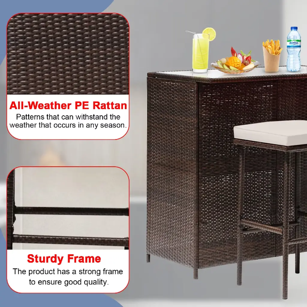 BestMassage Patio Bar set is crafted with a modern design in sleek natural rattan. The set includes a bar table and stools featuring a durable metal frame for stability and a tempered glass tabletop that resists scratches and adds an elegant touch. Two built-in storage shelves at the back of the bar provide convenient space for organizing foods, drinks, and ice. THe outsoor furniture set is designed for both functionality and aesthetics, this set is weather- and UV-resistant, making it perfect for any outdoor occasion. Enjoy effortless assembly with all necessary hardware included, and keep your set looking pristine with easy maintenance just wipe with a damp cloth. This bistro set blends contemporary style with practical features for an inviting and stylish addition to your home backyard or patio.