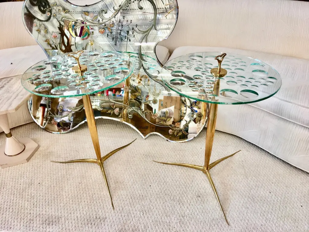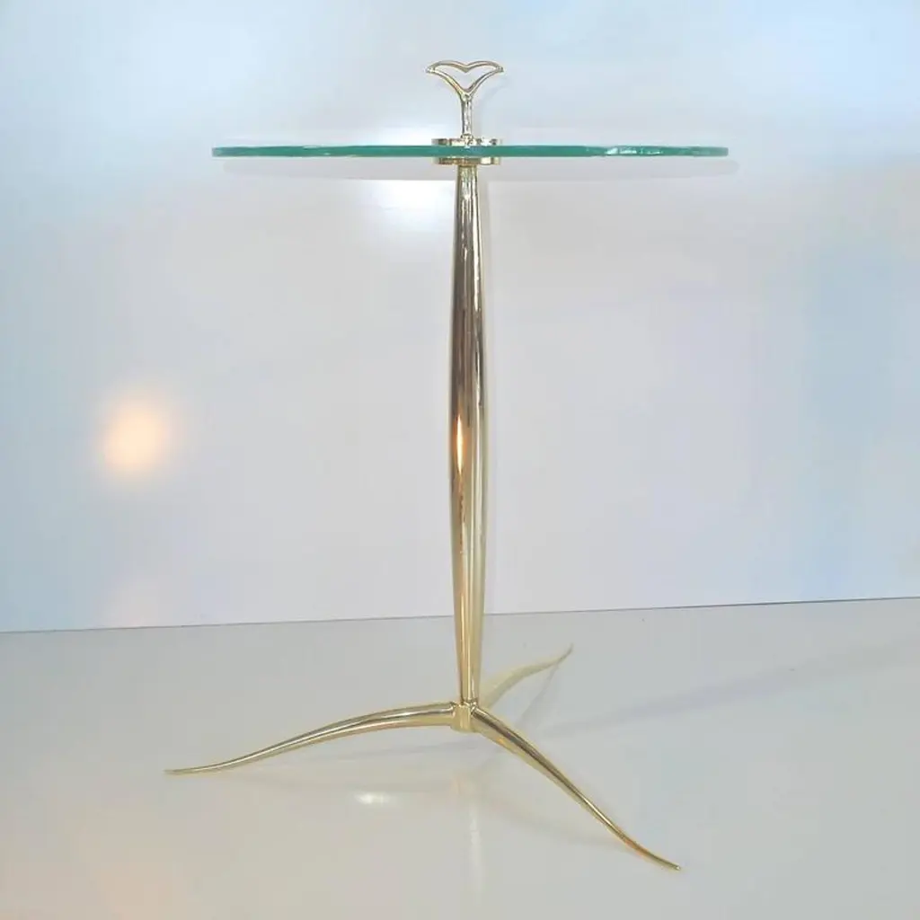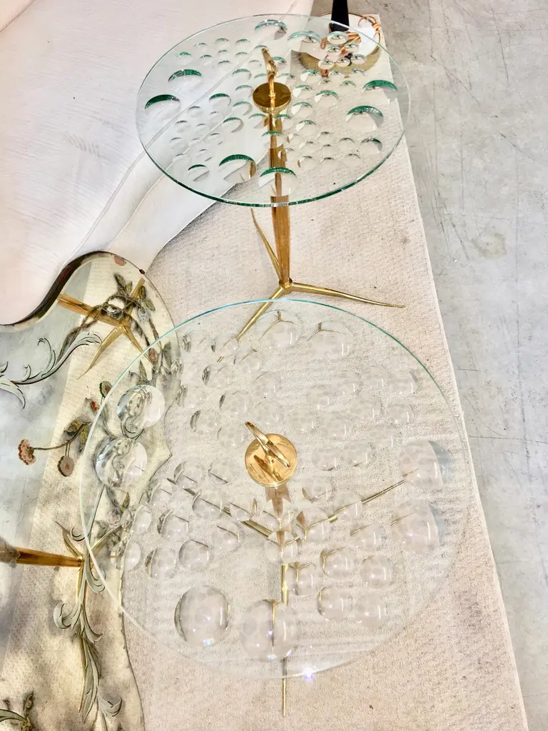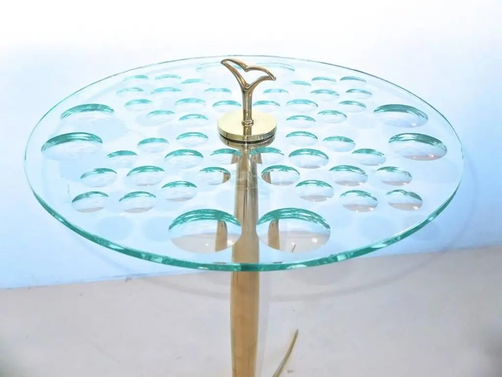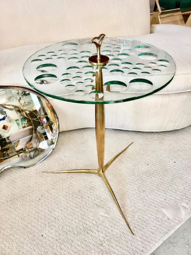 Exclusive limited edition (of two) occasional table custom crafted in the studio workshop of Beyond Gorgeosity, the Nonna table, our own new design created from selected vintage elements, marrying an elegant sinewy Italian solid brass tripod base from a 1947 Arredoluce 'bridge' lamp by Angelo Lelii, with a tapered spindle pedestal stem of polished solid brass supporting a round wheel-ground optical crystal bubble glass Magiscope top salvaged from the former studio of the late Mexican artist, Feliciano Bejar (1920 - 2007) and crowned with polished brass sculptural finial handle from a 1950's Italian magazine stand. BG's Nonna table stands 24-1/2 inches high, 28 inches including the finial. The glass top is 19-1/2 inches diameter and have the engraved signature "Feliciano Bejar '87" and "Feliciano Bejar '87", respectively.Both tables are currently available for sale individually or as a pair. Price shown is for one.Ask us for a custom shipping quote as the estimate shown is not always accurate.