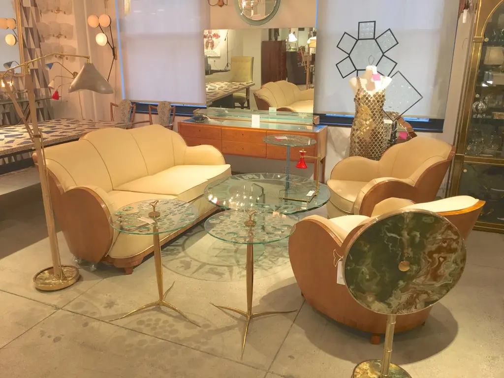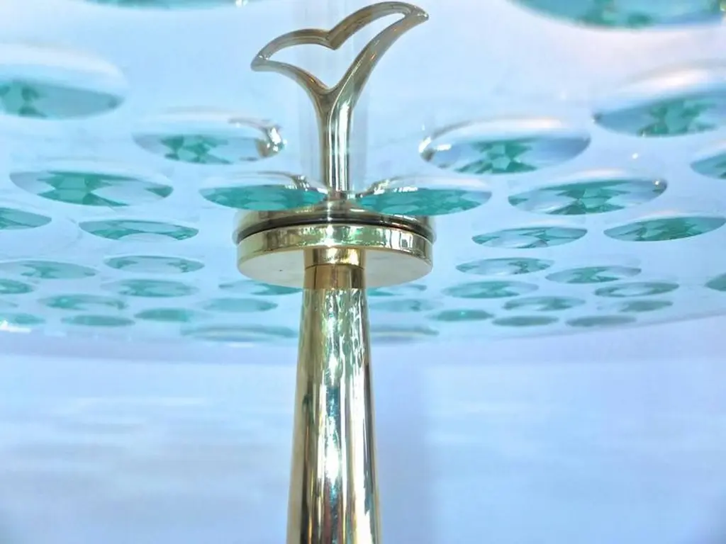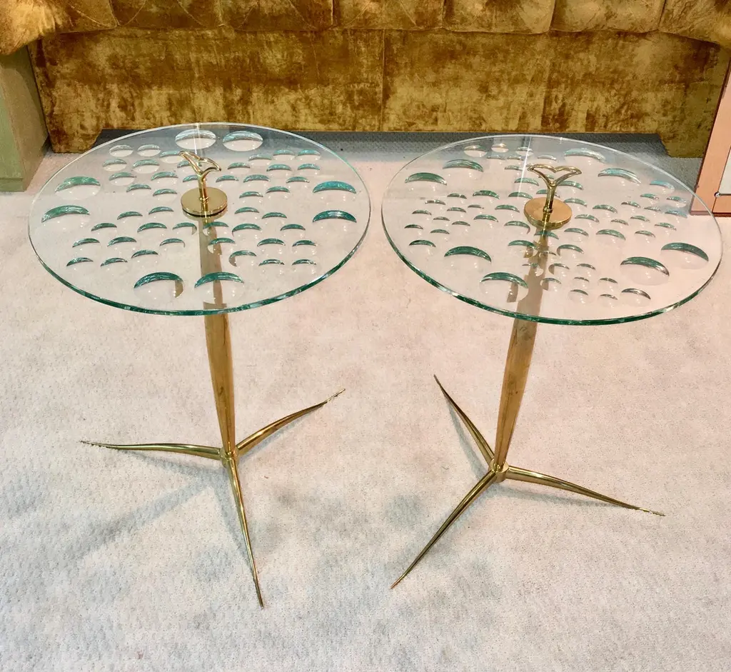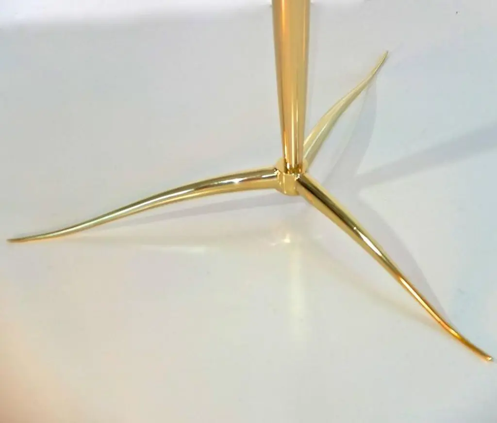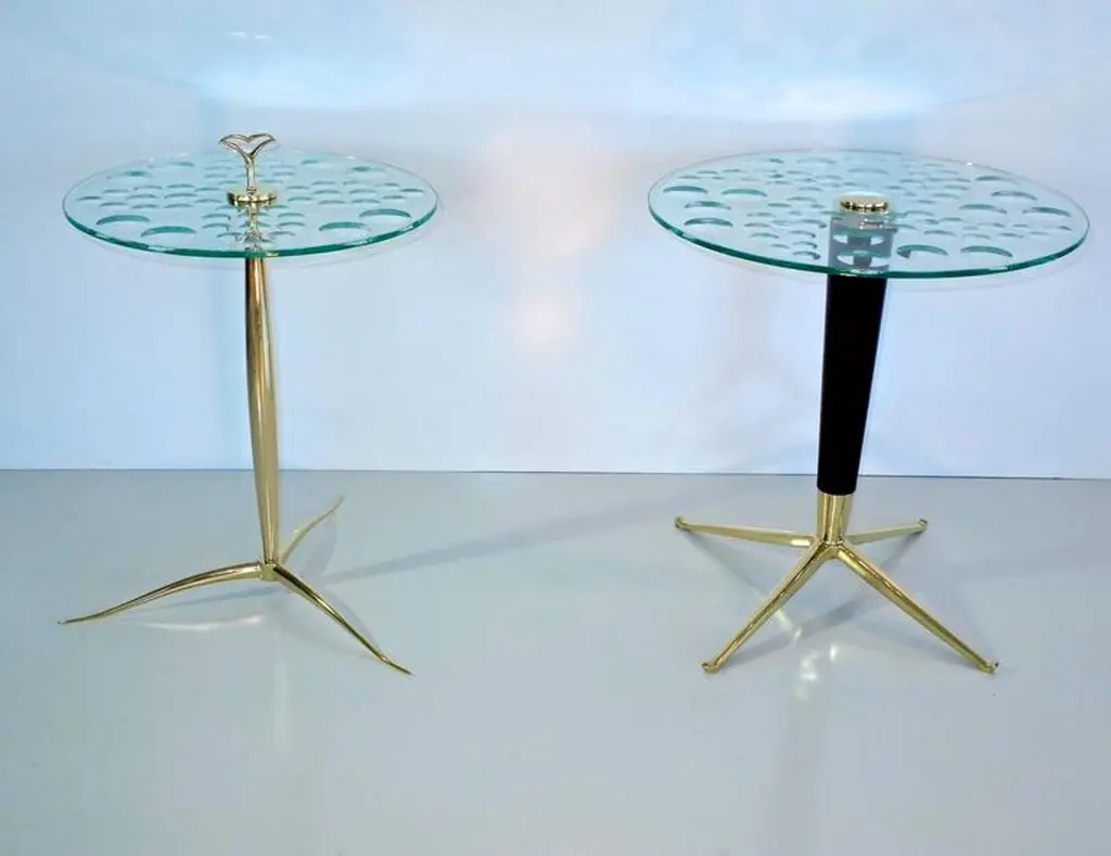 Exclusive limited edition (of two) occasional table custom crafted in the studio workshop of Beyond Gorgeosity, the Nonna table, our own new design created from selected vintage elements, marrying an elegant sinewy Italian solid brass tripod base from a 1947 Arredoluce 'bridge' lamp by Angelo Lelii, with a tapered spindle pedestal stem of polished solid brass supporting a round wheel-ground optical crystal bubble glass Magiscope top salvaged from the former studio of the late Mexican artist, Feliciano Bejar (1920 - 2007) and crowned with polished brass sculptural finial handle from a 1950's Italian magazine stand. BG's Nonna table stands 24-1/2 inches high, 28 inches including the finial. The glass top is 19-1/2 inches diameter and have the engraved signature "Feliciano Bejar '87" and "Feliciano Bejar '87", respectively.Both tables are currently available for sale individually or as a pair. Price shown is for one.Ask us for a custom shipping quote as the estimate shown is not always accurate.