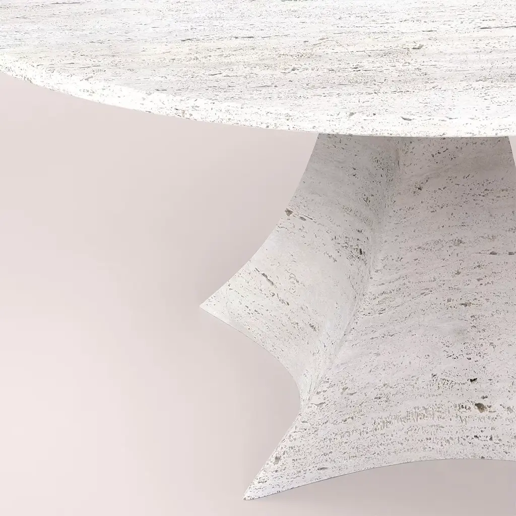 Inspired by the graceful fluidity of a dancer on stage, this round Travertine marble table is sure to seduce with its sculptural look, seemingly frozen in time. An intriguing twisted shape marks the base, which sustains the coordinated circular top resting above for a sophisticated and coherent natural open-pore texture. Hypnotizing and unique, it also comes in a precious Verde Alpi marble variant.