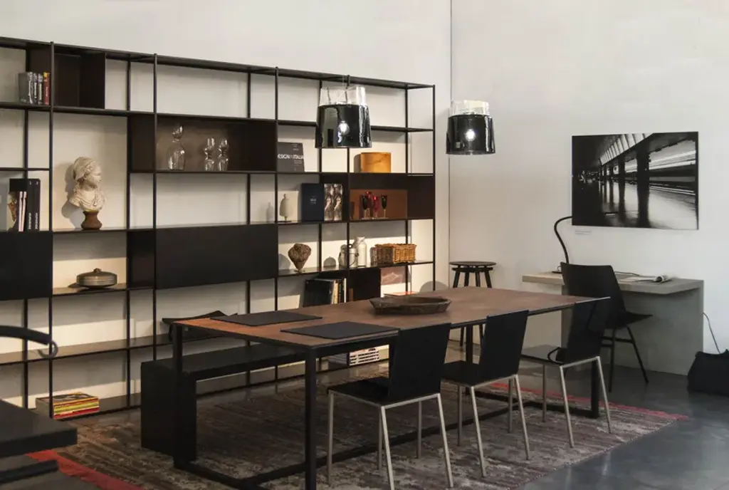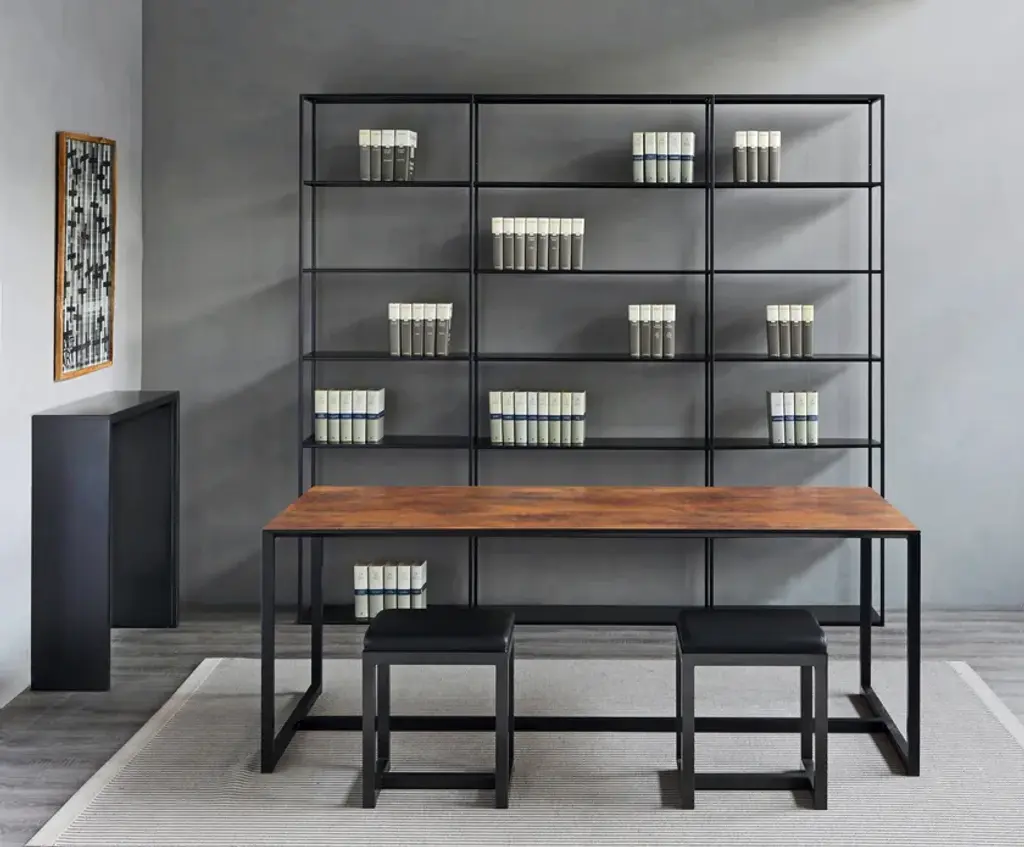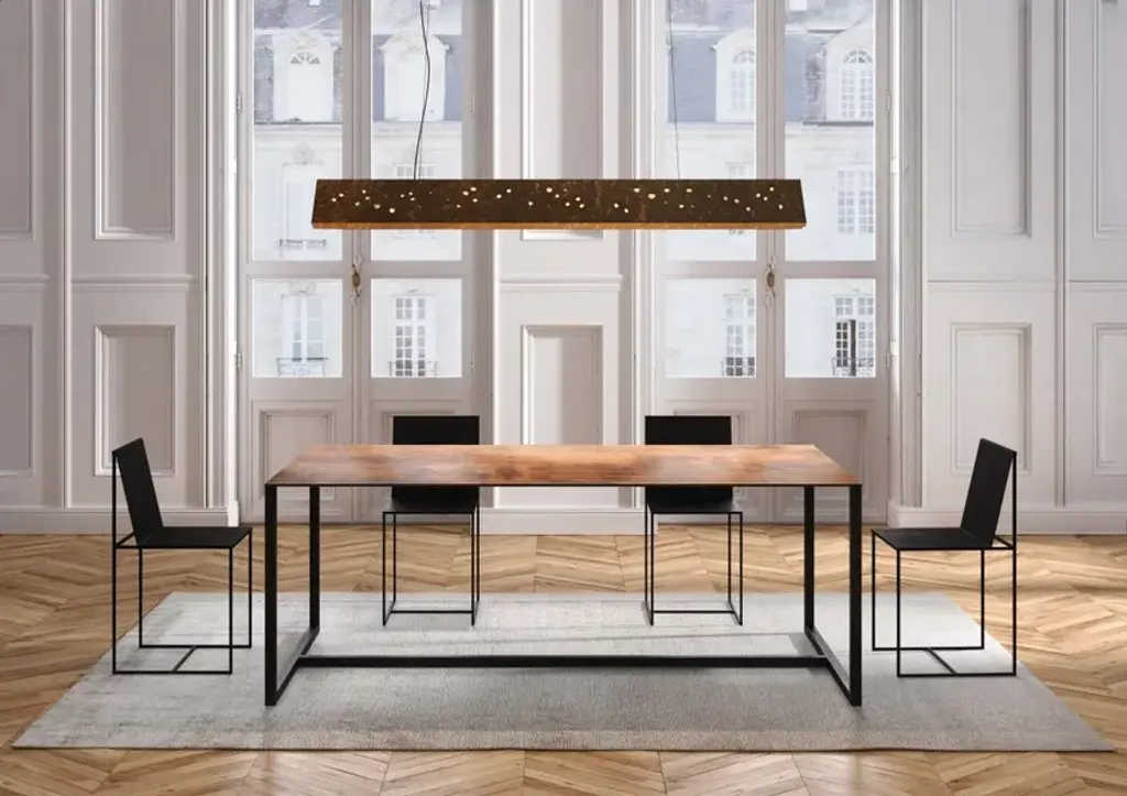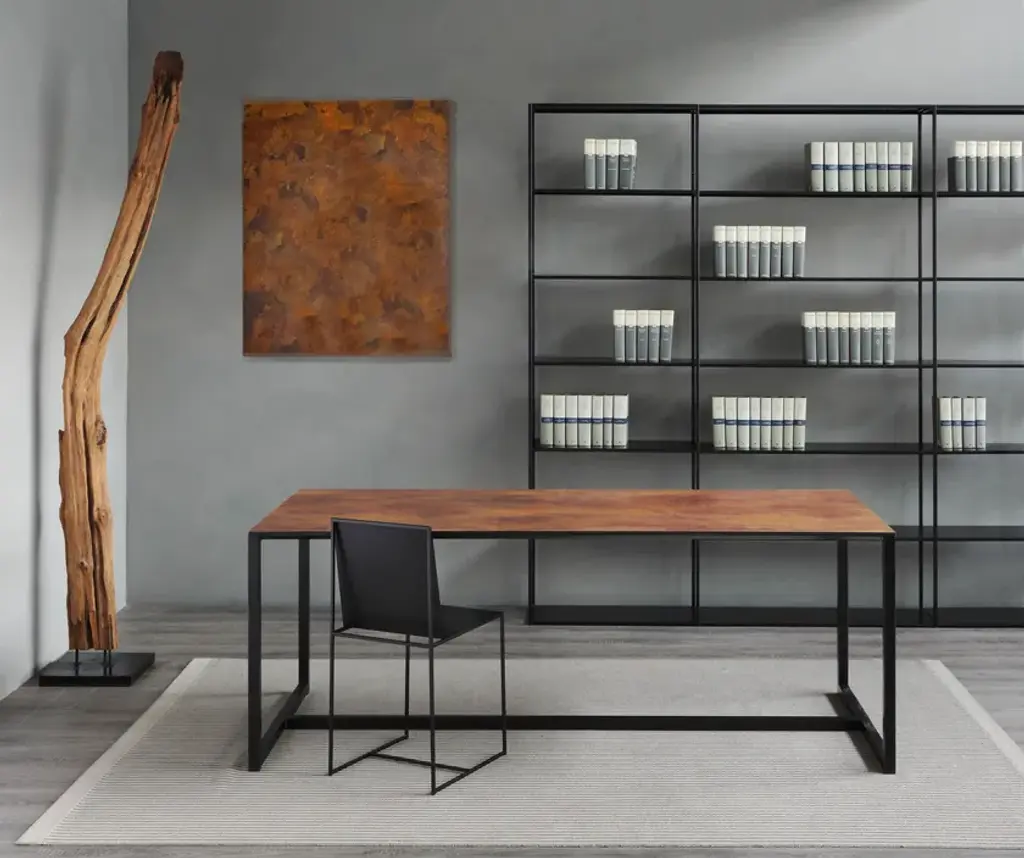 Big Brother is a rectangular HPL table.Frame: Copper black sand-touchTop: Black HPL / Rusty finish HPL