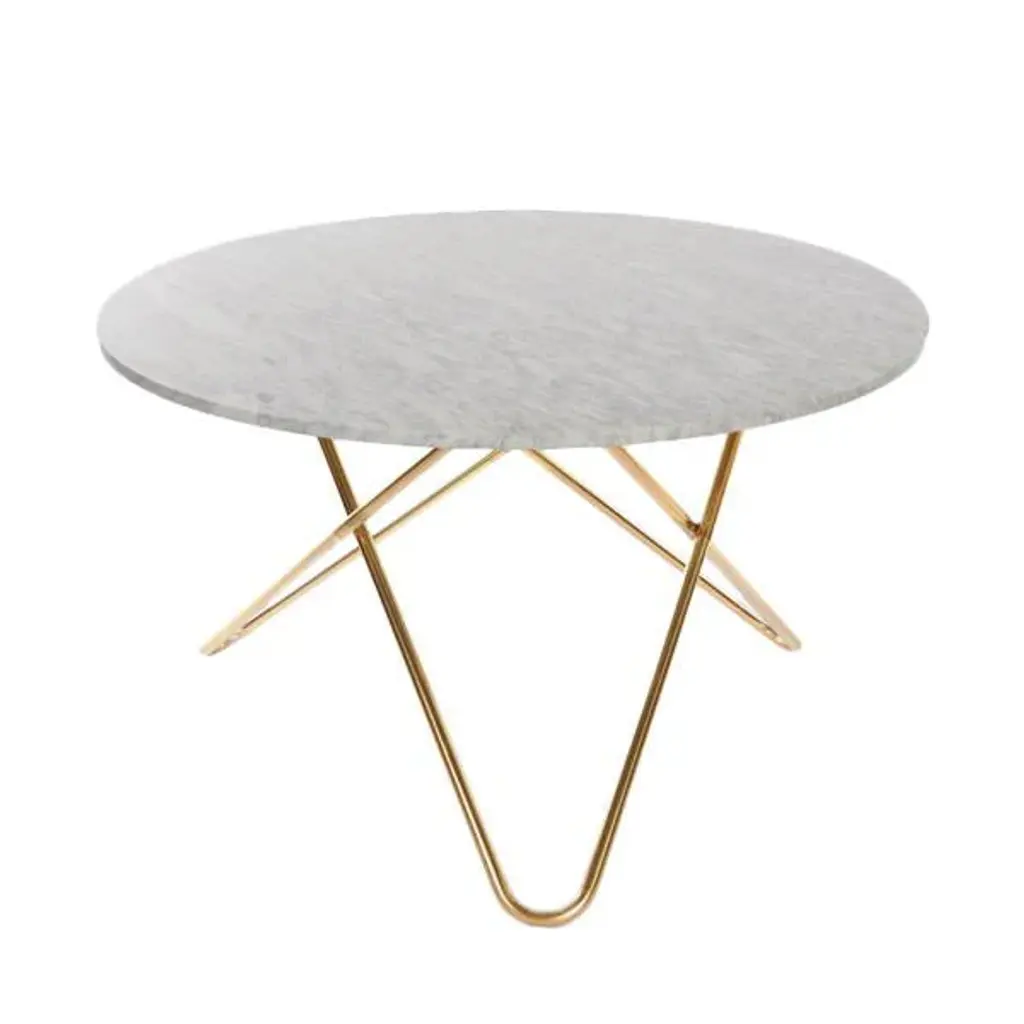 Frame made in stainless steel, powder coated steel or brass (steel with brass surface). Marble tops to be placed directly onto the frame. Table tops will exhibit natural variations in terms of colour, drawings and patterns characteristic for each type of marble. As for Carrara Marble, small cracks can sometimes be found on the polished surface. This phenomenon known as “taroli" is a natural characteristic of the stone, which cannot be eliminated completely.