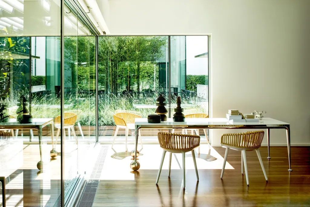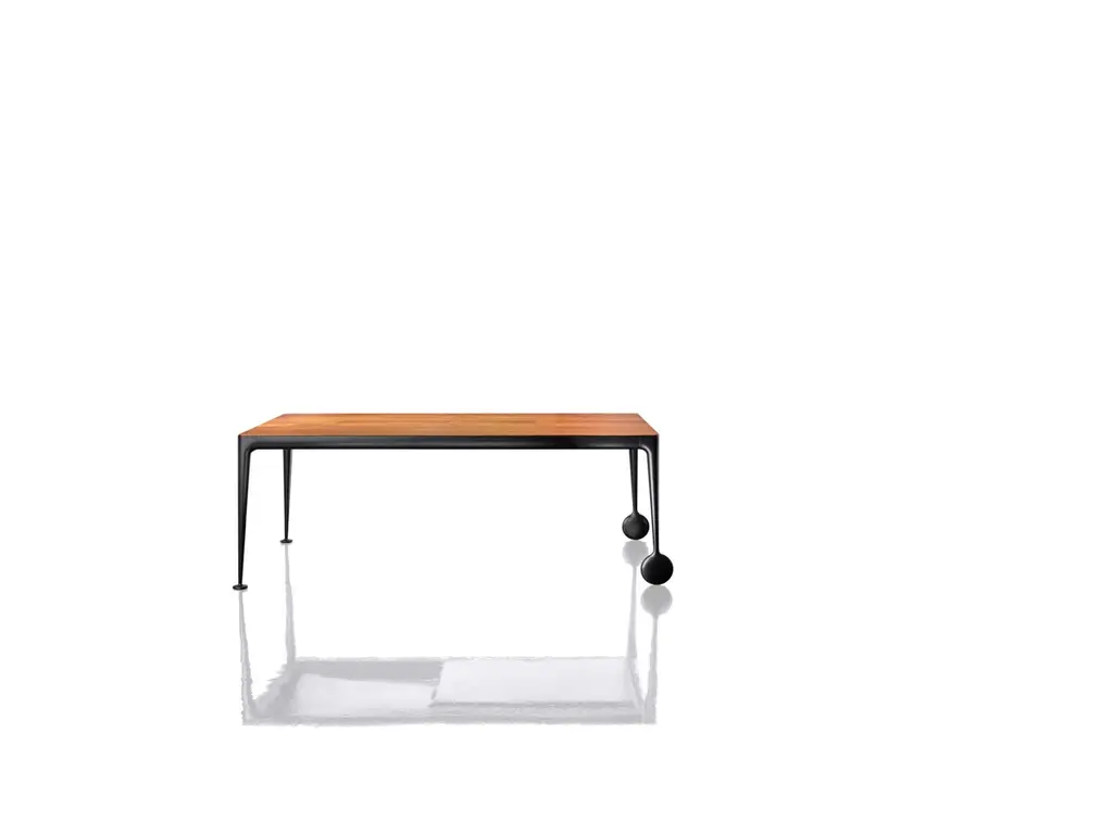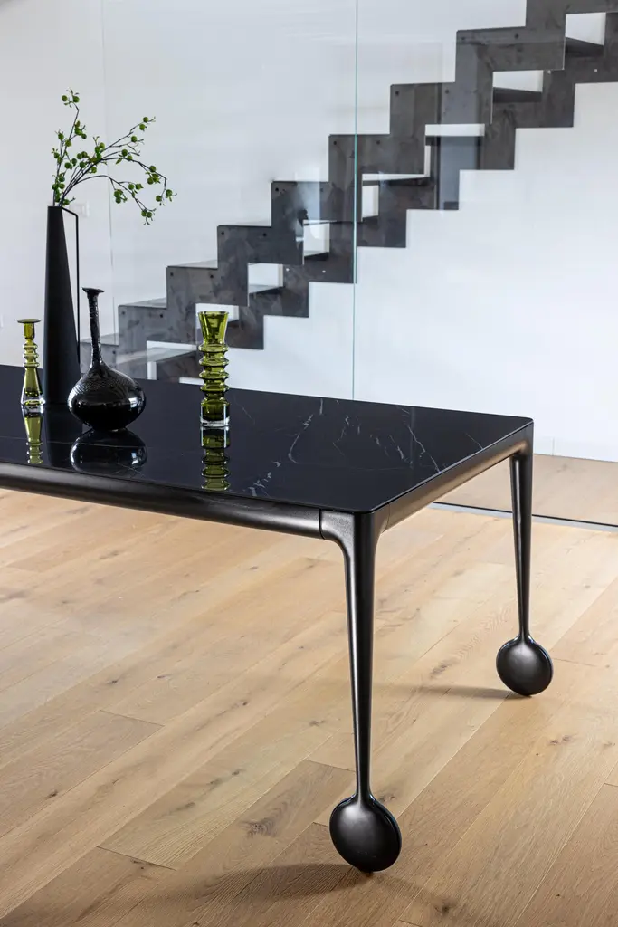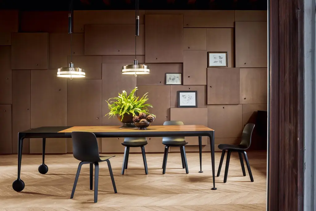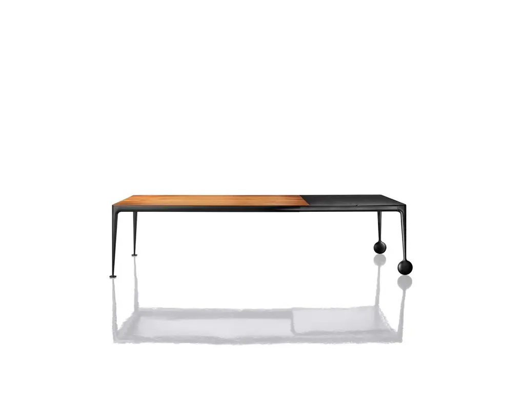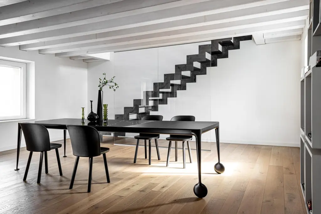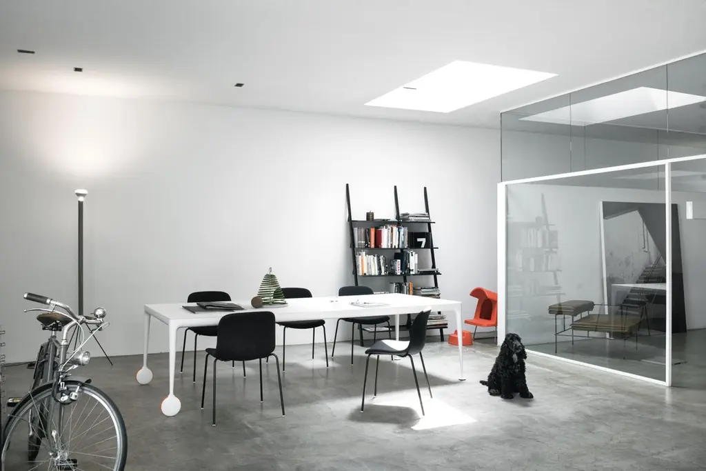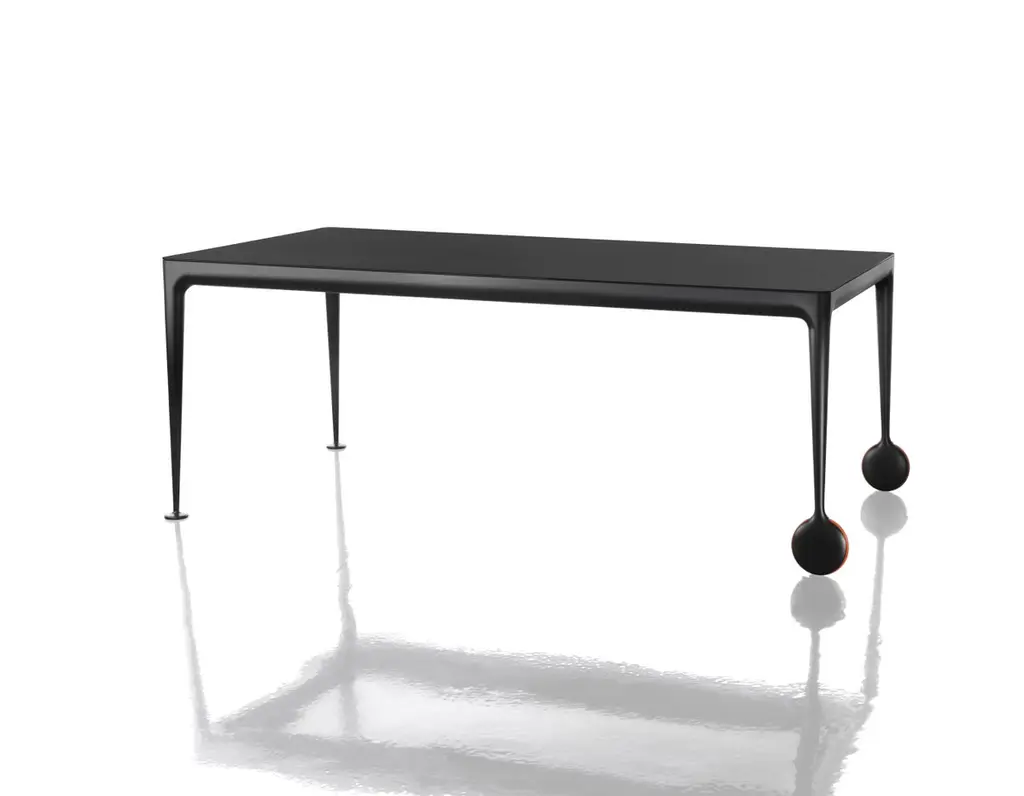 Big Will table marks another chapter in a gripping story, in which the Magis phi- losophy and technology, with its friendly shapes and rigorous production, meets the creative spirit of Philippe Starck.The Big Will table is actually equipped with two fixed legs ending with rubber pads and two legs ending with wheels that move easily. It’s interesting the contrast with the sober lines, the classic materials and the modernity of the ingenious wheel sys- tem.Big Will’s most striking and characterful features are its wheels – positioned at the extending end of the table - and the die-cast aluminium structure, which comes either in a glossy finish or painted white or black. The top could be in tempered glass, acid-etched or in American walnut. Leaves for extendable ver- sion are in MDF laminate painted.Legs are in die-cast aluminium and can be polished or painted. Crosspieces are in aluminium, polished or painted.The table is available in four dimensions and also as an extendable version.The extandable version measures 200 x 100 cm closed, but with two 50-cm exten- sion leaves, it can reach a maximum overall length of three metres.The table can be extended effortlessly, without needing to lift it, simply by gliding the extending end on the floor thanks to the two wheels, and to a patented sliding and locking mechanism developed especially for Big Will.
