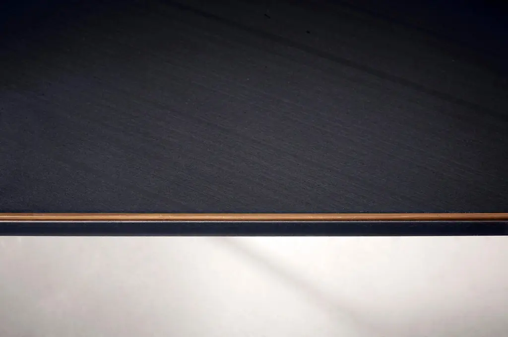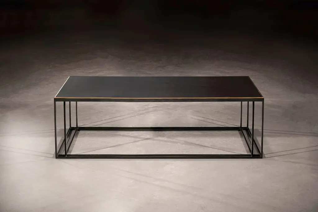 A coffee table in blackened steel and honed Cumbrian slate, with a polished brass trim. Hand crafted to order in the North. Bespoke finishes and sizes are available.Measures: 120cm width x 80cm depth x 35cm height.Custom finishes and sizes available upon request.Made to order in 12 weeks.Price excludes VAT.