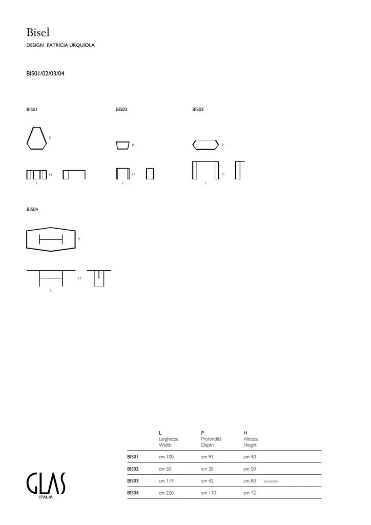 Collection of high tables, low tables and console, made in multi-layered and multichromatic glass, created by laminating five slabs of 5mm extralight glass each with a different colored film. The obtained glass sheets are in different shapes, shiny ground polished and “faceted” by means of unique bevels accentuating through the transparency of the glass the stunning multicolored material. The different components are then welded together in total clarity, by means of a special gluing technique, so creating very precious “furniture jewels”. Available in green or ochre finish.Patricia Urquiola was born in Oviedo (Spain) in 1961. Lives and works in Milan. She attended the School of Architecture of Madrid Polytechnic and Milan Polytechnic, where she graduated in 1989 with Achille Castiglioni. From 1990 to 1992 she was assistant lecturer to both Achille Castiglioni and Eugenio Bettinelli in Milan and Paris. From 1990 to 1996 she was responsible for the new product development office of DePadova, working with Vico Magistretti. In 1996 she became head of Lissoni Associati’s design group. In 2001 she opens her own studio working on product design, architecture, installations. Amongst her last projects of architecture: Mandarin Oriental Hotel in Barcelona and W Retreat&Spa a Vieques (Porto Rico); a villa in Udine; scenography of the opera “L’incoronazione di Poppea” by Monteverdi; showroom and installations for Hermès, Gianvito Rossi, Flos, Moroso, H&M and the general concept of Pitti Immagine Firenze. She designs for the most important Italian and international firms as Agape, Alessi, Andreu World, Artelano, Axor, B&B Italia, Bart Design, Bisazza, BMW, Bosa, Budri, Chevalier Edition, Il Coccio, De Padova, De Vecchi, Driade, Emu, Fasem, Salvatore Ferragamo, Flos, Foscarini, Gallotti & Radice, Gandia Blasco, Glas Italia, Kartell, Kettal, Kvadrat, Mixing Media, Maurice Lacroix, Liv’it, Peter Mabeo, MDF Italia, Molteni, Moroso, Mutina, Olivari, Panasonic, Paola Lenti, Rosenthal, Champagne Ruinart, San Lorenzo, Tronconi, Viccarbe. Consulting for Honda and LG. Some of her products are exposed in the permanent collection of MoMA in New York and other international museums. She has won several international prices and awards. Amongst others the Medalla de Oro al Mérito en las Bellas Artes 2010 awarded by the Spanish Government (2011) and the A&W Magazine nomination as Designer of the Year 2012.Additional information:- Dimensions: BIS01 W 100, D 91, H 40 cm- Finishes: Green or Ochre.Please note that the list price excludes VAT. An additional VAT charge may apply.