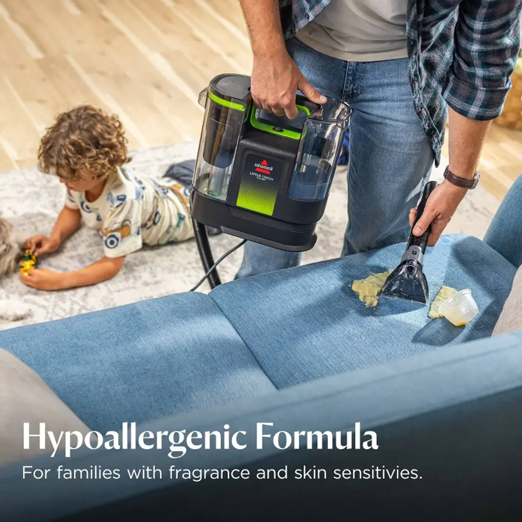 BISSELL® Little Green™ Pet Oxy Free & Clear Spot & Stain formula is made for portable carpet cleaners. This powerful formula tackles tough messes that happen on carpet and upholstery, including food and beverage stains, kitchen grease, and more. It has powerful OXY technology that permanently removes pet messes and tackles dander allergens while containing no heavy metals, dyes or perfumes and is safe for use around kids and pets when used as directed. BISSELL proudly supports BISSELL Pet Foundation® and its mission to help save homeless pets. When you buy a BISSELL® product, you help save pets, too. We’re proud to design products that help make pet messes, odors and pet homelessness disappear.