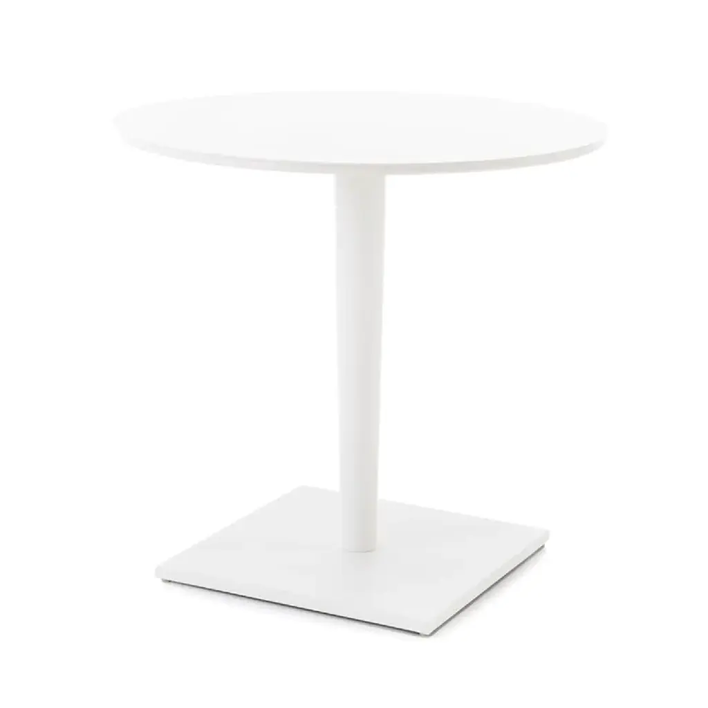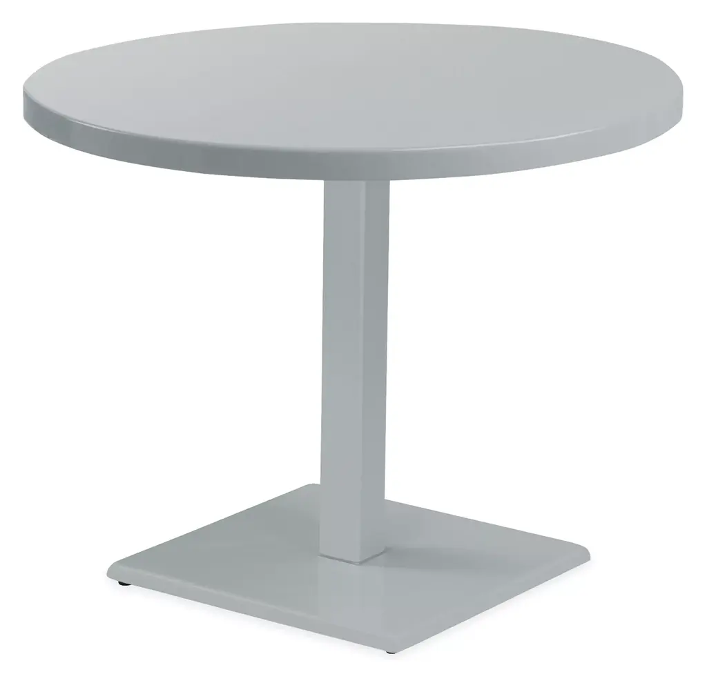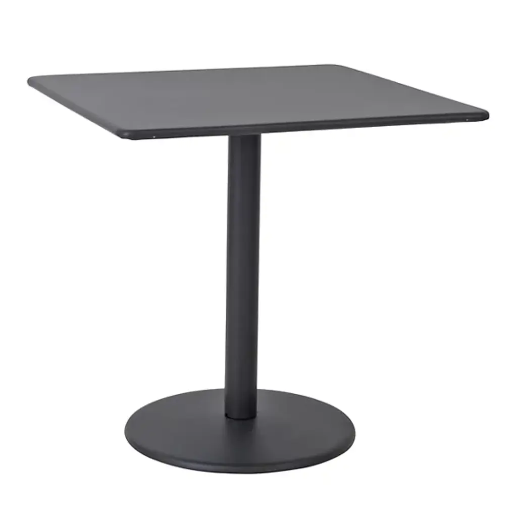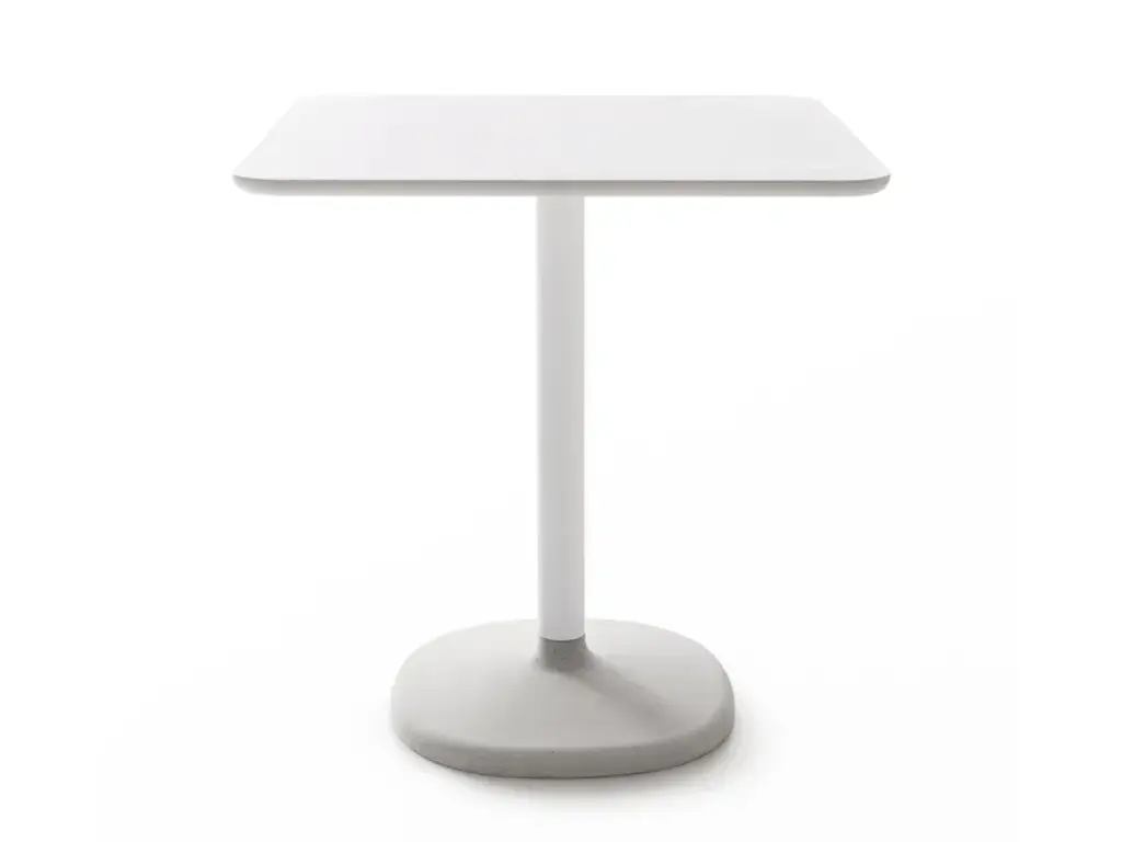 Bring bold appeal to exteriors with the tough yet tasteful lines of the Bistro Outdoor Table from emu. A disc-shaped metal base keeps the table balanced, extending a central column up to a square, solid steel top. The tabletop’s rounded corner contrasts well with the circular base, providing ample room for chairs around it, while an E-Coating provides an excellent protective surface able to withstand wind, rain, and sun in outdoor environments.
