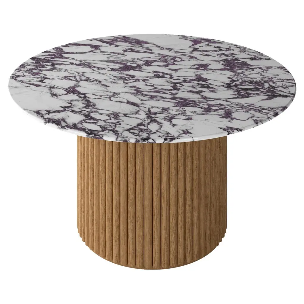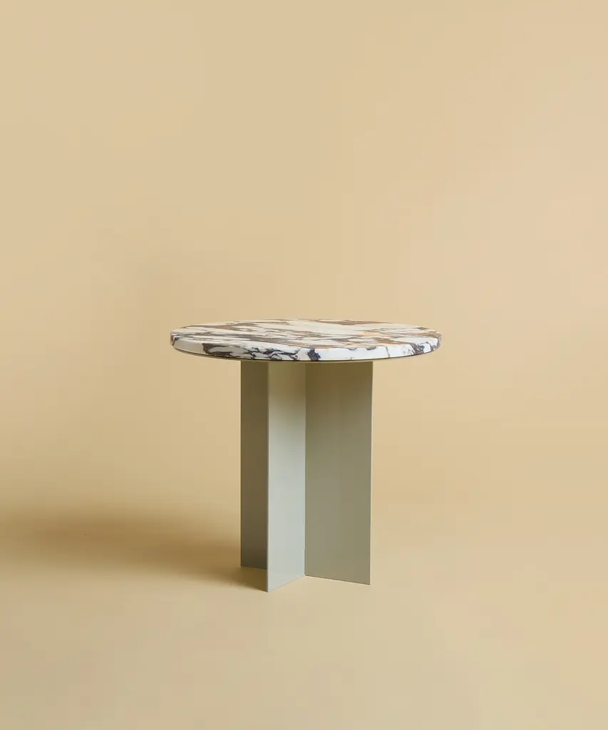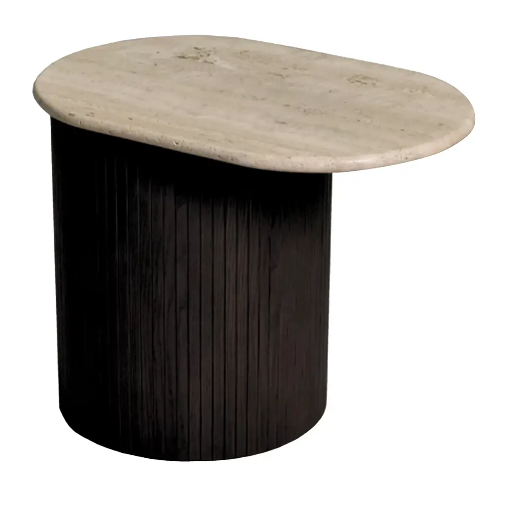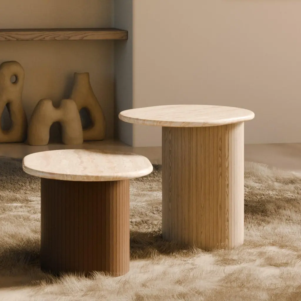 Small tables with round base made of lathash wood and travertine marble top.Available in two heights that can bematched together. available stonesEmperador darkSahara NoirPulpis brownWhite calacatta.