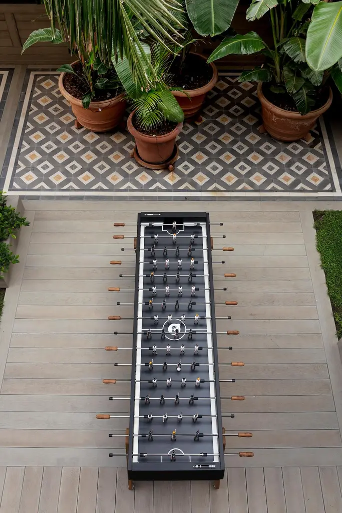 FOOSBALL TABLE RS3 MAX in GreenDESIGNED BY RAFAEL RODRÍGUEZ for RS BarcelonaThe more, the merrier. It’s not just a saying, it’s really true. The RS MAX football table doubles the fun so you can make the most of the game and some good company. Are you ready to play?For Residential Offices HospitalityIntense useIndoor & Outdoor useCustomization optionsAlmost assembledDesigned & Manufactured in SpainGo big. Take it to the max. The RS MAX foosball table shows that although two is company, three is not a crowd; an even eight is the perfect number to exploit the potential and benefits of this foosball table.The RS MAX is the long brother of the RS3 Wood foosball table. We’ve stretched it out and resized it to double the fun, accommodating eight players instead of four. This makes it the ideal game for community spaces and group settings. More players. More laughter. More goals. More excitement.It’s manufactured in high-quality materials in order to withstand intensive use by lots of players, not to mention inclement weather in the case of outdoor use. Its robust structure provides stability for precise, perfect gameplay.Each color (white, black and green) comes with standard teams. However, the RS MAX is customizable. You can choose your favorite teams and field color. You can decide whether to have players with legs joined together or two legs. You can have male players, female players or mixed teams, and you can choose the color of their skin. You can even have logos.Design your own RS MAX and make it unique.It comes with the field a little bit concave, so the ball doesn't stop moving. This way the game is more dynamic.The line up is: 1-3-4-3-3-3-3-3-3-3-3-3-3-4-3-1.Structure:Steel with cataphoretic coating process and micro textured powder coated polyester paintLegs:Iroko woodField:HPLPlayers:Cast aluminiumHandles:WoodMeasures (LxWxH)276x128x92 cm / 108x51x36 inWeight125 kg / 275.6 lbIncludes:Ball set7 units (5 standard balls and 2 silent balls)4 extra players2 per teamThe products we love and appreciate, those that are part of our everyday luxury, also deserve luxury care. Our pieces are crafted of high quality materials to last over time. Although age can catch up with us, it is possible to preserve their original appeal and beauty by caring for them regularly to protect them from environmental elements and the effects of time, specially the pieces you enjoy outdoors.Estimated Delivery time: 9-11 Weeks