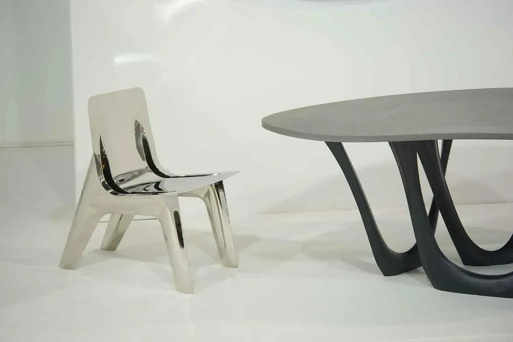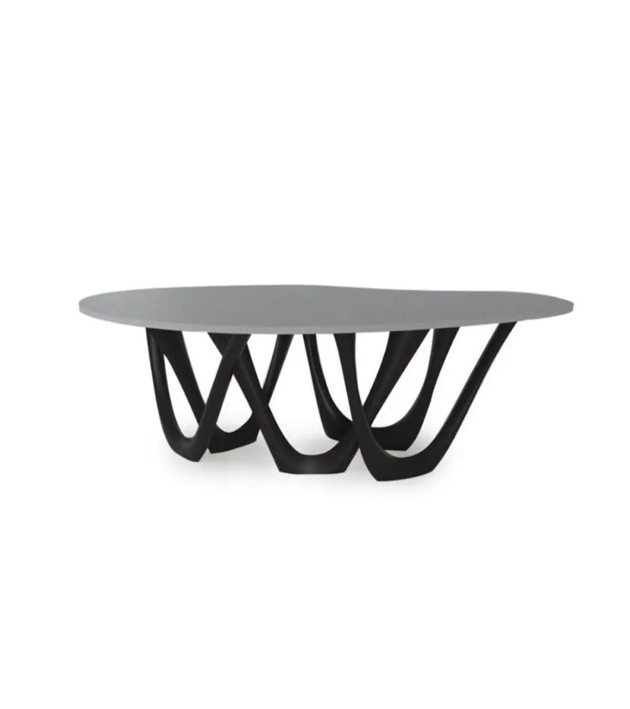Black brown concrete steel G-Table by ZietaDimensions: D 110 x W 220 x H 75 cm Material: Concrete top. Carbon steel base. Finish: Powder-Coated.Available in colors: Beige, Black/Brown, Black glossy, Blue-grey, Concrete grey, Graphite, Gray Beige, Gray-Blue, Moss Grey, Olive Green, Pale green, Resende, Stone gray, Tele gray, Umbra Grey, White Glossy, White Matt, Window grey or Yellow Olive. Available in finishes: Stainless Steel, Wood top, and Aluminum.G-Tables is a series of bionically shaped objects that are customized for customers' needs. Each table is “tailor-made” and created together with the user who can choose from a variety of materials, finishes and also decide about parameters like the number of people sitting at the table. The shape of the table, leg construction, and legs layout is optimized by the algorithm applied by designers to fit the distant space and meet the most demanding interiors.About Zieta: Zietas main goal is to deliver uniqueness and customization in design and construction while keeping the production, transport, and warehousing innovatively efficient.This is how they imagine the future world: Light, durable structures of customized applications produced on demand out of one-of-a-kind parts, yet efficiently.They use a computer-controlled production process. Customized pattern, customized form, customized function, one-of-a-kind product, and outstanding precision are what they deliver.You will find all of this philosophy reflected in the products. The research, they discover new possibilities, they play with forms and they deliver a beautiful, innovative, surprising outcome to people who love the design and who care about design development.They believe their work is a valuable contribution to the world of design not only by the unique beauty of the forms but most of all by opening ultra-innovative opportunities of forming and new paths for the world of the future.