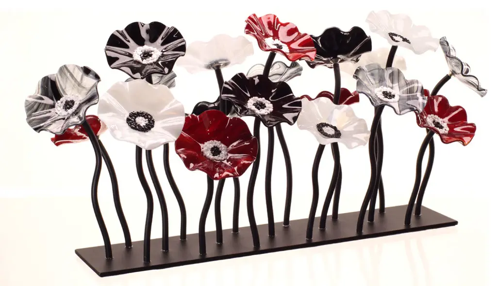 Kiln formed glass flowers are screwed onto the end of each aluminum stem and configured in these vibrant colors. The base is shaped in a long rectangle with flowers facing in all directions making it a perfect table centerpiece. Each piece is unique. Exact arrangement and colors may vary slightly.