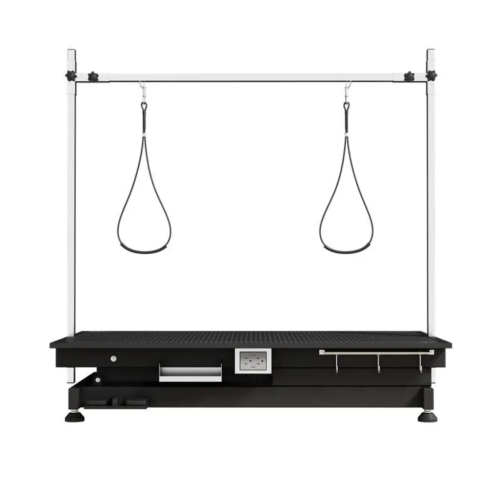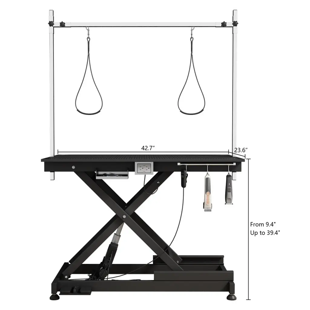 Professional Electric Lift X Style Durable Grooming Table is latest-designed for maximum comfort on part of the groomer. The base structure is made of steel and is an X-style frame designed for wider lifting range, lifting the table from a MIN height of 8" to a staggering MAX 36" in a matter of seconds. The table itself is framed perfectly for all the pets, measuring 49.6" X 26", providing plenty of surface room for the pet to sit on. The surface Board of the table is removable freely without any screw. The board covered with antistatic rubber mat in surface that is slip-resistant and geared towards keeping pets in place. Table can lift with loading pets 150 lbs, and the motionless loading capacity is 330 lbs.