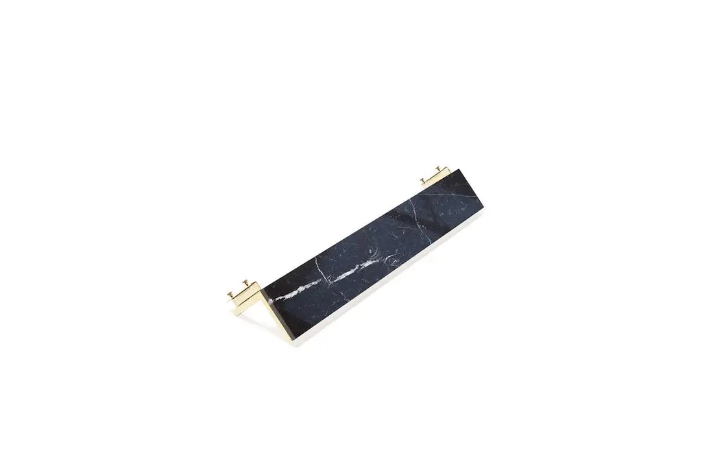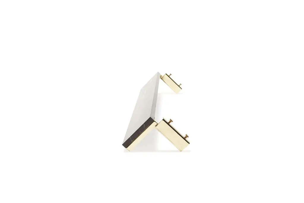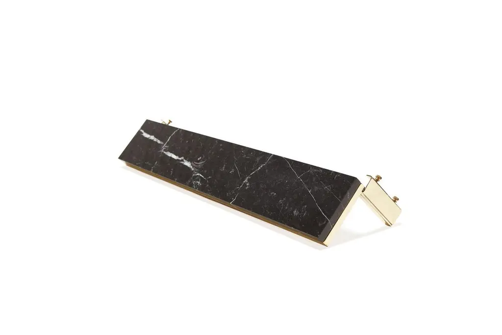 This unique table was designed specifically to pair with the Inheritance sofa, two seat sofa, or armchair by Stephen Kenn. It clips to the side of the frame and can be easily secured with thumb screws. The table provides a small surface for cups or books, and can be moved from one side of the seating element to the other with ease. Every Stephen Kenn piece is made to order through our Los Angeles studio in partnership with a number of small businesses and fabricators in the LA area. Shown here with a polished brass plated frame and black marble tabletop, this table is also available with steel, wood, or marble top and a range of metal finishes for the base. Please message us to see our Customization Guide with all available options.