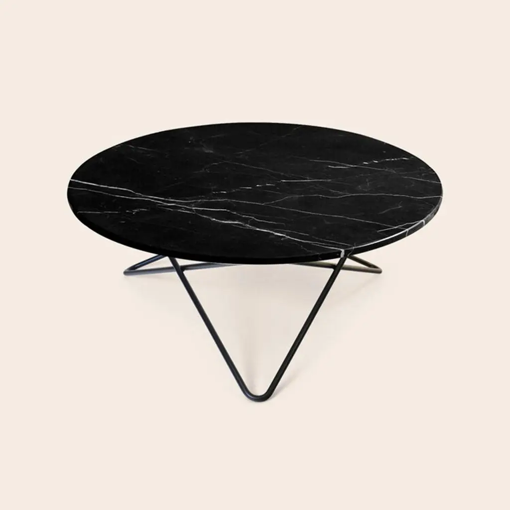 Black Marquina marble and black steel large o table by OxDenmarqDimensions: D 100 x H 40 cmMaterials: Steel, black Marquina marbleAvailable in other size. Different top and frame options availableOX DENMARQ is a Danish design brand aspiring to make beautiful handmade furniture, accessories and lighting in natural high-quality materials in fair prices. " When we set out back in 2003, we were primarily working with vegetable-tanned saddle leather thus the name OX was a tribute to our unique leather and the animal providing it.The other half of our name, DENMARQ, is chosen to emphasize that we are a Danish design brand based on the Danish design tradition and that most of our furniture is produced in Denmark. However, DENMARQ not only refers to our home country, but also to the co-founder and designer - DENnis MARQuart.Before finishing his design studies at the Copenhagen Design University, Dennis Marquart did a Blacksmith education. This background is extremely useful when developing and designing products."OX DENMARQ handmade products will only get more beautiful as time passes and natural patina sets in.Many OX products are shaped around marble or vegetable-tanned saddle leather. Stone and leather are materials that will, and should, get marks over time. But they will also age with a very special beauty. When you learn to appreciate the beauty of maturity and of time passing, you have learned to appreciate patina the way it should be appreciated.