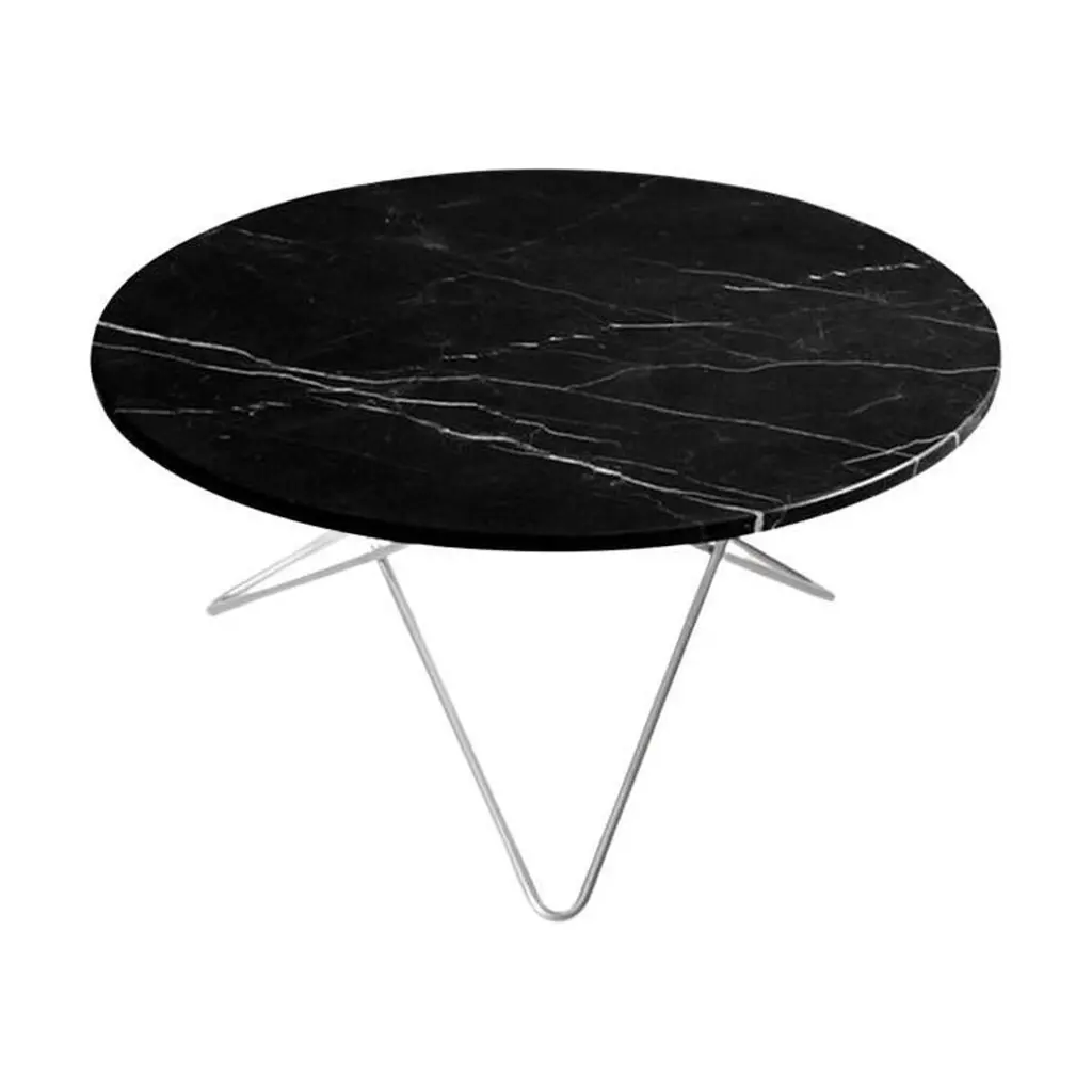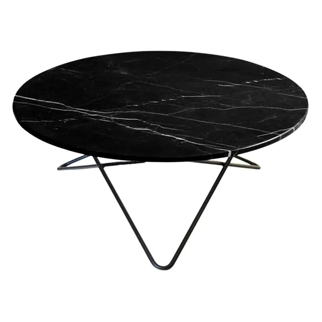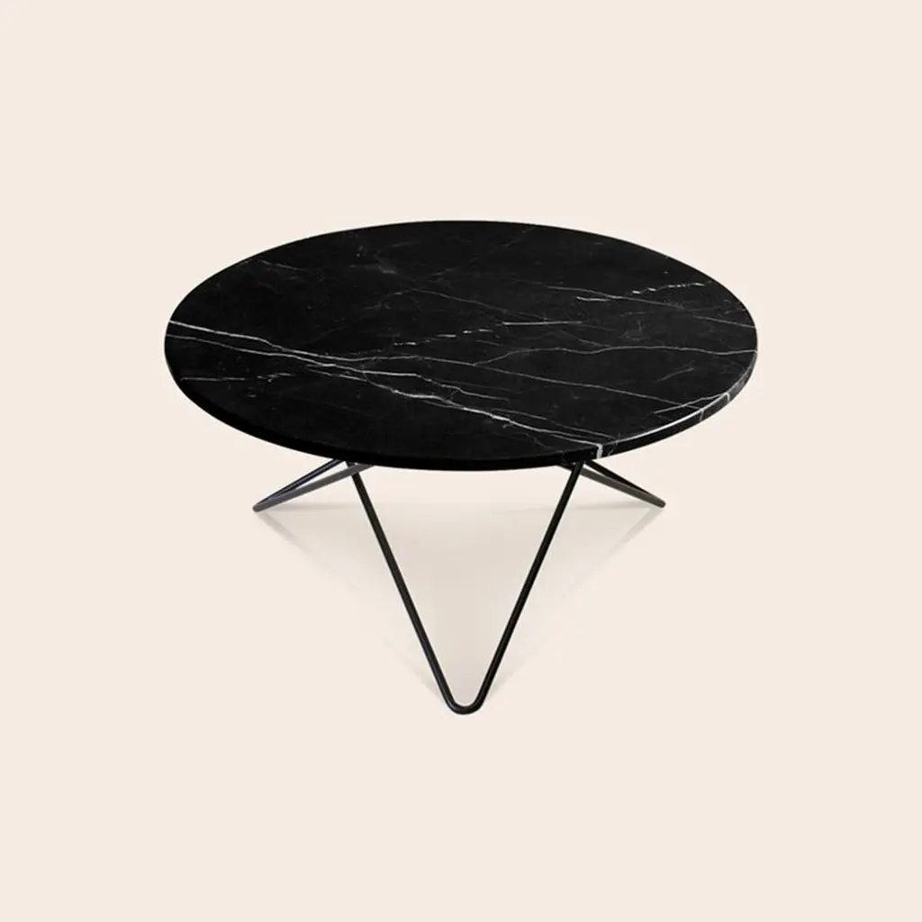 Black Marquina Marble and Black Steel "O" Table by Ox DenmarqDimensions: D 80 x H 40 cmMaterials: Steel, Black Marquina MarbleAvailable in other size. Different top and frame options available,OX DENMARQ is a Danish design brand aspiring to make beautiful handmade furniture, accessories and lighting in natural high-quality materials in fair prices. " When we set out back in 2003, we were primarily working with vegetable-tanned saddle leather thus the name OX was a tribute to our unique leather and the animal providing it.The other half of our name, DENMARQ, is chosen to emphasize that we are a Danish design brand based on the Danish design tradition and that most of our furniture is produced in Denmark. However, DENMARQ not only refers to our home country, but also to the co-founder and designer - DENnis MARQuart.Before finishing his design studies at the Copenhagen Design University, Dennis Marquart did a Blacksmith education. This background is extremely useful when developing and designing products."OX DENMARQ handmade products will only get more beautiful as time passes and natural patina sets in.Many OX products are shaped around marble or vegetable-tanned saddle leather. Stone and leather are materials that will, and should, get marks over time. But they will also age with a very special beauty. When you learn to appreciate the beauty of maturity and of time passing, you have learned to appreciate patina the way it should be appreciated.