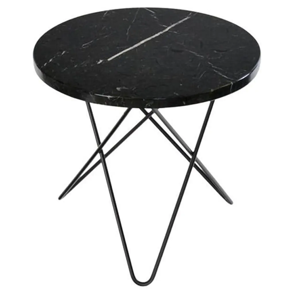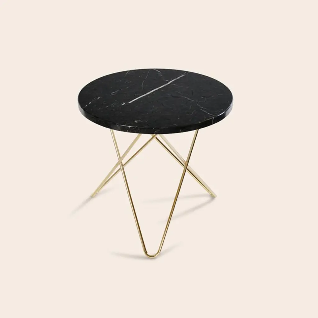 Black Marquina Marble and Brass Mini O Table by OxDenmarqDimensions: D 40 x H 37 cmMaterials: Brass, Black Marquina MarbleAlso Available: Different top and frame options available,OX DENMARQ is a Danish design brand aspiring to make beautiful handmade furniture, accessories and lighting in natural high-quality materials in fair prices. " When we set out back in 2003, we were primarily working with vegetable-tanned saddle leather thus the name OX was a tribute to our unique leather and the animal providing it.The other half of our name, DENMARQ, is chosen to emphasize that we are a Danish design brand based on the Danish design tradition and that most of our furniture is produced in Denmark. However, DENMARQ not only refers to our home country, but also to the co-founder and designer - DENnis MARQuart.Before finishing his design studies at the Copenhagen Design University, Dennis Marquart did a Blacksmith education. This background is extremely useful when developing and designing products."OX DENMARQ handmade products will only get more beautiful as time passes and natural patina sets in.Many OX products are shaped around marble or vegetable-tanned saddle leather. Stone and leather are materials that will, and should, get marks over time. But they will also age with a very special beauty. When you learn to appreciate the beauty of maturity and of time passing, you have learned to appreciate patina the way it should be appreciated.