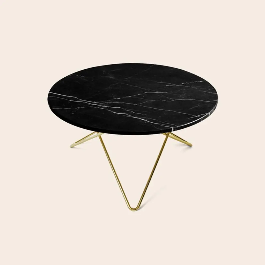 Black Marquina Marble and Brass "O" Table by Ox DenmarqDimensions: D 80 x H 40 cmMaterials: Brass, Black Marquina MarbleAvailable in other size. Different top and frame options available,OX DENMARQ is a Danish design brand aspiring to make beautiful handmade furniture, accessories and lighting in natural high-quality materials in fair prices. " When we set out back in 2003, we were primarily working with vegetable-tanned saddle leather thus the name OX was a tribute to our unique leather and the animal providing it.The other half of our name, DENMARQ, is chosen to emphasize that we are a Danish design brand based on the Danish design tradition and that most of our furniture is produced in Denmark. However, DENMARQ not only refers to our home country, but also to the co-founder and designer - DENnis MARQuart.Before finishing his design studies at the Copenhagen Design University, Dennis Marquart did a Blacksmith education. This background is extremely useful when developing and designing products."OX DENMARQ handmade products will only get more beautiful as time passes and natural patina sets in.Many OX products are shaped around marble or vegetable-tanned saddle leather. Stone and leather are materials that will, and should, get marks over time. But they will also age with a very special beauty. When you learn to appreciate the beauty of maturity and of time passing, you have learned to appreciate patina the way it should be appreciated.
