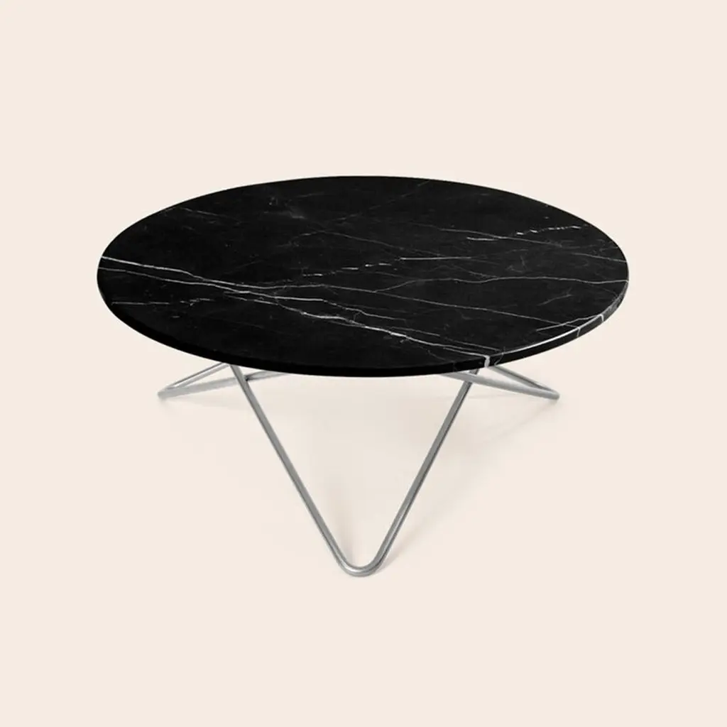 Black Marquina Marble and Steel Large O Table by OxDenmarqDimensions: D 100 x H 40 cmMaterials: Steel, Black Marquina MarbleAvailable in other size. Different top and frame options available,OX DENMARQ is a Danish design brand aspiring to make beautiful handmade furniture, accessories and lighting in natural high-quality materials in fair prices. " When we set out back in 2003, we were primarily working with vegetable-tanned saddle leather thus the name OX was a tribute to our unique leather and the animal providing it.The other half of our name, DENMARQ, is chosen to emphasize that we are a Danish design brand based on the Danish design tradition and that most of our furniture is produced in Denmark. However, DENMARQ not only refers to our home country, but also to the co-founder and designer - DENnis MARQuart.Before finishing his design studies at the Copenhagen Design University, Dennis Marquart did a Blacksmith education. This background is extremely useful when developing and designing products."OX DENMARQ handmade products will only get more beautiful as time passes and natural patina sets in.Many OX products are shaped around marble or vegetable-tanned saddle leather. Stone and leather are materials that will, and should, get marks over time. But they will also age with a very special beauty. When you learn to appreciate the beauty of maturity and of time passing, you have learned to appreciate patina the way it should be appreciated.