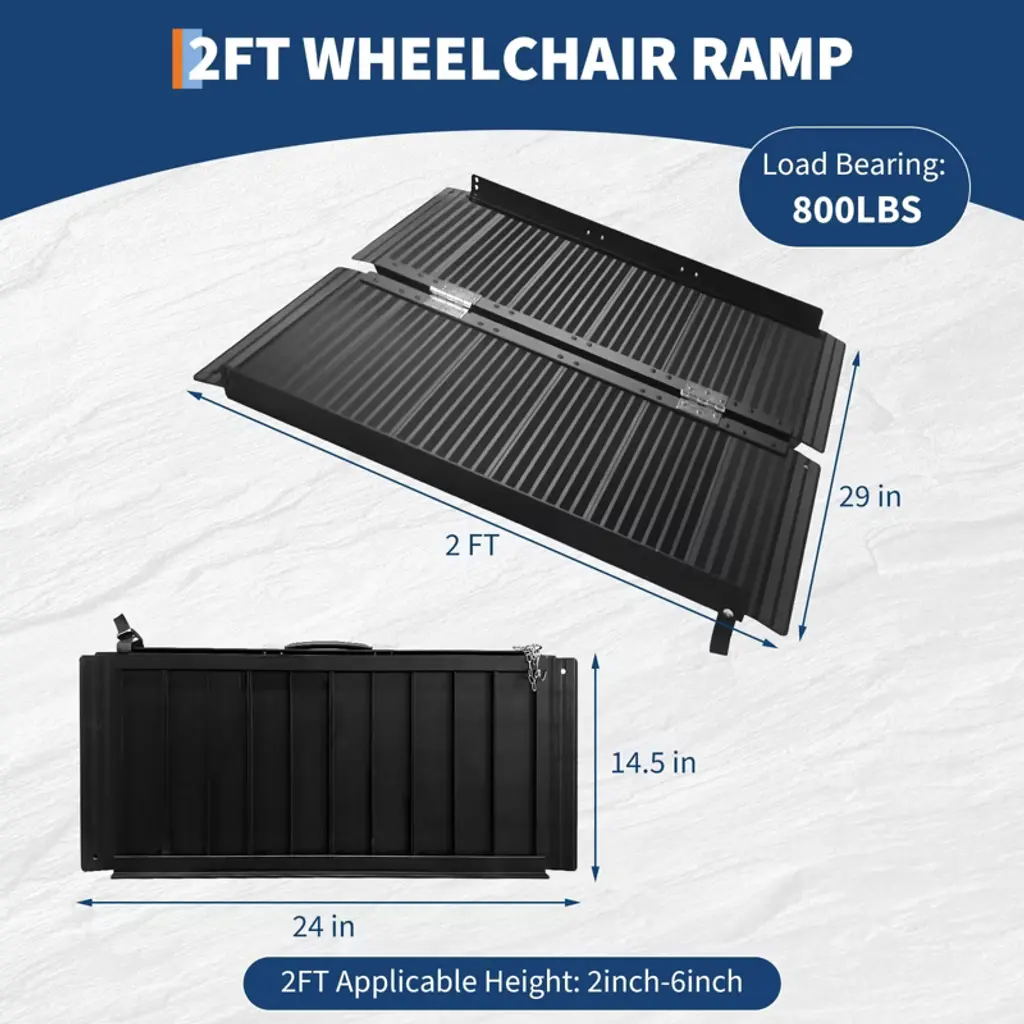 2FT Portable Wheelchair Ramp ¨C Lightweight Aluminum Ramp with 800LB Capacity, Non-Slip Surface for Home Steps & Doorways (24"L x 29"W, Black)Key Features & Specifications:Heavy-Duty Yet Lightweight800 lbs weight capacity (high-strength aluminum construction)13.7 lbs lightweight for easy portabilityCorrosion-resistant black finish for long-lasting durabilityAdvanced Safety FeaturesDeep anti-slip grooves for maximum traction in all weatherRubber grip pads on transition plates prevent slidingStainless steel hinges for smooth, trip-free operationCompact & Portable DesignFolds to 24"L x 14.5"W (stores in tight spaces)Unfolds to 24"L x 29"W working size2-6 inch height range ideal for single-step transitionsUniversal Accessibility SolutionNo installation required - ready to use immediatelyWorks with:? Wheelchairs & mobility scooters? Baby strollers & walkers? Delivery carts & luggagePerfect for home entryways, curbs, and single-step transitionsUser-Friendly FeaturesSeamless transition plates eliminate bumpsReinforced edges for added stabilityEasy-clean surface requires minimal maintenance