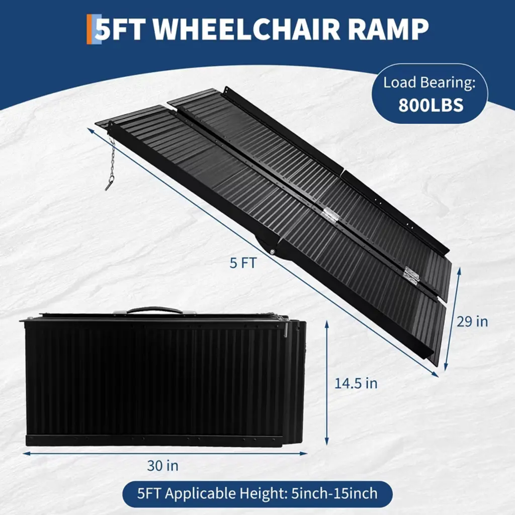 5FT Portable Wheelchair Ramp ¨C Heavy-Duty Aluminum Ramp with 800LB Capacity, Non-Slip Surface for Home Steps & Doorways (60"L x 29"W, Black)Key Features & Specifications:Industrial-Strength Construction800 lbs weight capacity (aircraft-grade aluminum)30.86 lbs robust yet portable framePowder-coated black finish resists corrosion/rustMaximum Traction Safety SystemDeep diamond-tread pattern for all-weather gripDual rubber transition pads prevent slidingReinforced stainless steel hinges eliminate trippingExtended Accessibility Solution5-15 inch height range (ideal for 2-3 step transitions)Unfolded dimensions: 60"L x 29"WFolds to 60"L x 14.5"W for vertical storageUniversal Mobility AccessInstantly deploys - no assembly requiredSupports:? Electric wheelchairs (up to 800lbs)? Power scooters & walkers? Hand trucks & golf cartsPerfect for residential porches, raised doorways, and curbsProfessional-Grade FeaturesBevelled transition edges for smooth roll-onWeight-tested certification includedWeatherproof for year-round outdoor use
