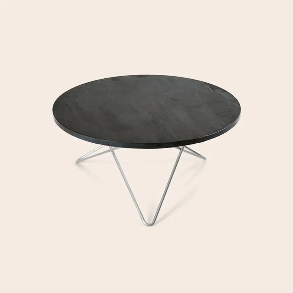 Black slate and steel "O" table by OxDenmarqDimensions: D 80 x H 40 cmMaterials: steel, slate.Available in other size. Different top and frame options available.Ox Denmarq is a Danish design brand aspiring to make beautiful handmade furniture, accessories and lighting in natural high-quality materials in fair prices. " When we set out back in 2003, we were primarily working with vegetable-tanned saddle leather thus the name OX was a tribute to our unique leather and the animal providing it.The other half of our name, DENMARQ, is chosen to emphasize that we are a Danish design brand based on the Danish design tradition and that most of our furniture is produced in Denmark. However, DENMARQ not only refers to our home country, but also to the co-founder and designer - DENnis MARQuart.Before finishing his design studies at the Copenhagen Design University, Dennis Marquart did a Blacksmith education. This background is extremely useful when developing and designing products."Ox Denmarq handmade products will only get more beautiful as time passes and natural patina sets in.Many OX products are shaped around marble or vegetable-tanned saddle leather. Stone and leather are materials that will, and should, get marks over time. But they will also age with a very special beauty. When you learn to appreciate the beauty of maturity and of time passing, you have learned to appreciate patina the way it should be appreciated.