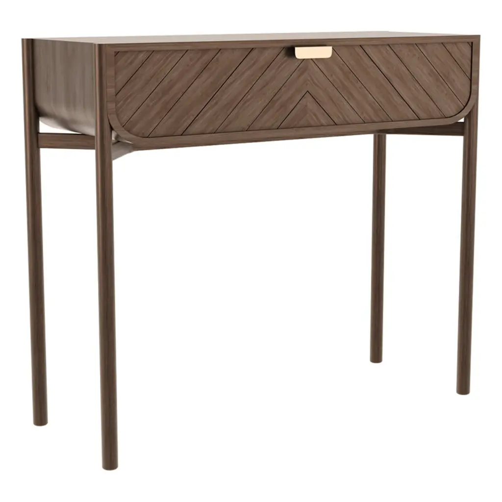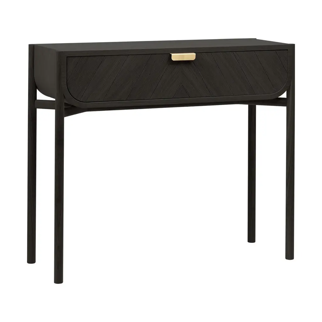 Black Stained Oak Marius Console Table by HARTODimensions: W 100 x D 36.5 x H 90 cm. Materials: Solid Wood, MDF wood veneer. Weight: 20.0 kgThe Marius console, with its drawer engraved with chevrons and its refined brass handle, is suitable for all uses, in an entrance hall, in the living room or in a bedroom. Have you imagined it, topped with a mirror, as a dressing table? Or even as a sideboard, to display your most beautiful objects?Made in Portugal, the 100cm Marius natural oak console is made from solid oak and oak veneer. The Marius console is a creation of Pierre-François Dubois.About: Hartô, a French furniture brand, was born in 2012 from the desire of its founders to offer a different design, less elitist, which combines the useful with the beautiful. A light, joyful design, as if to say "I'm fed up" (with boring furniture): this is the meaning of the word harto in Spanish. The first pieces of the collection, the desks offer a new vision on a market that was then quite sparse, and offer functional tips and a joyful, colorful design, out of step with the archetypes. The foundations of the Hartô spirit are laid: a free spirit, a design of the useful, curved shapes, colors. In a word: creativity! And of course, from the beginning, this translates into collaborations with talented designers. This spirit crosses the years and the collections, evolves, refines itself, without ever denying itself. Today, audacity and creativity are still there, and are translated in a subtle way, all in elegance. At Hartô, the freedom to create is also based on strong commitments to quality and durability: the furniture is made by the best local craftsmen, who use noble materials to give life to pieces that will last through the ages.All our lamps can be wired according to each country. If sold to the USA it will be wired for the USA for instance.