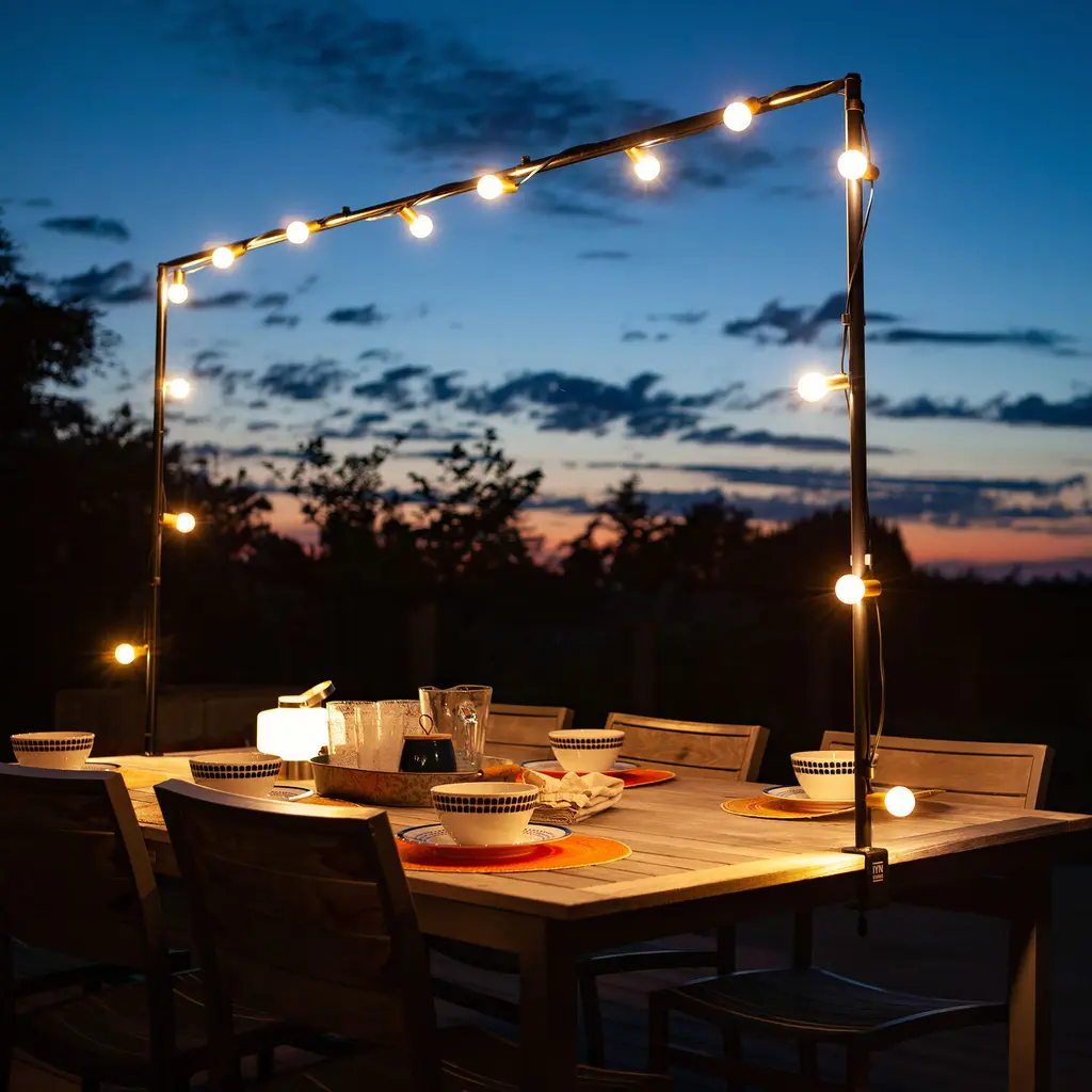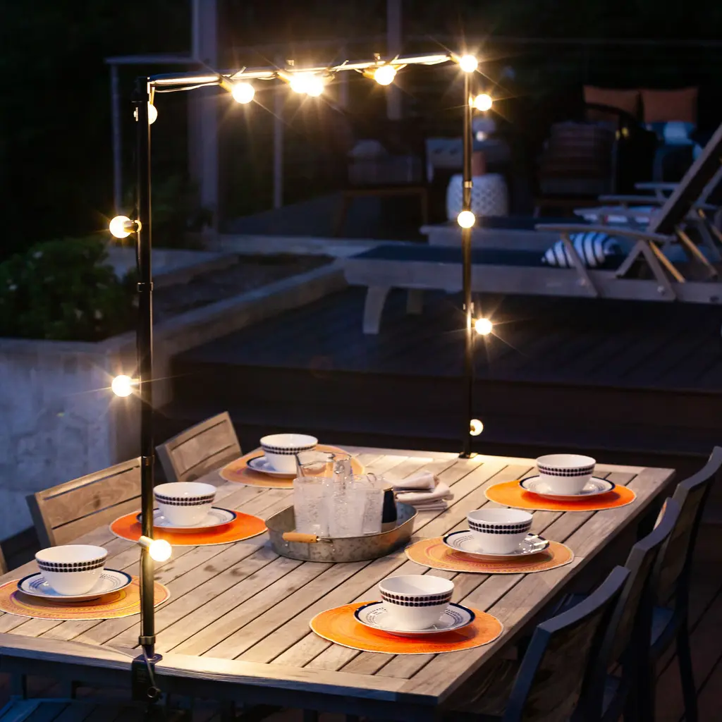 Illuminate outdoor weddings, backyard parties and indoor events with this IYN string-light table stand featuring a durable black-steel frame and clamps. Easy to assemble, the frame is adjustable to fit tables up to eight feet in length. Creating instant ambience for indoor and outdoor entertaining, you can amplify the effect by clipping draped string lights or decor onto this stylish IYN stand.