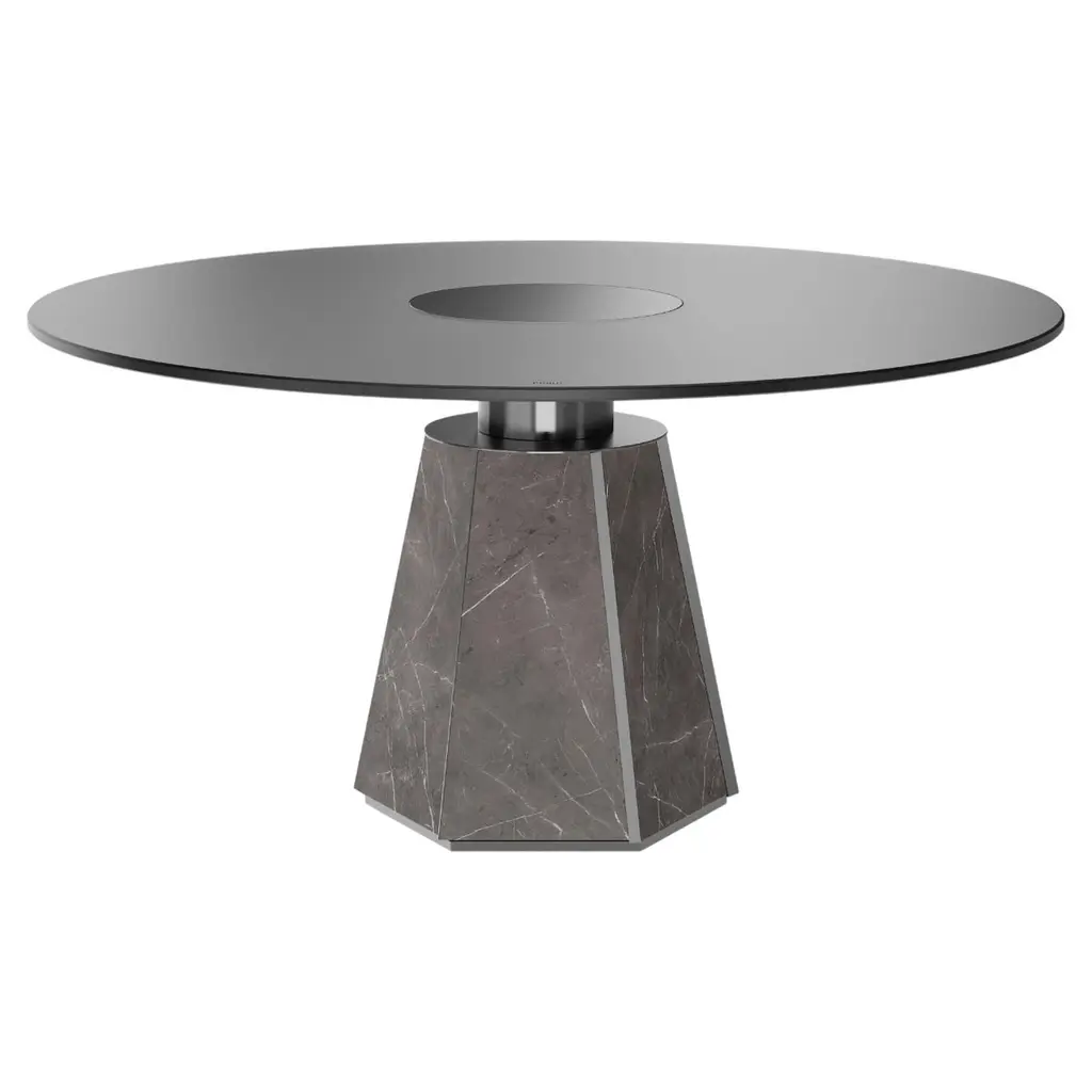 This table is inspired by the shapes and typical grooves of the Greek columns, as a symbol of solidity and a reference to the idea of eternity. The tabletop houses in its center polished metal discs, framed by a series of grooves inspired by the reverberation of the waves caused by a stone thrown into still water. The base is made from two large steel pipes which are sectioned into 8 parts. The cuts are then turned over and re-welded together. The table top is machined on large vertical lathes.