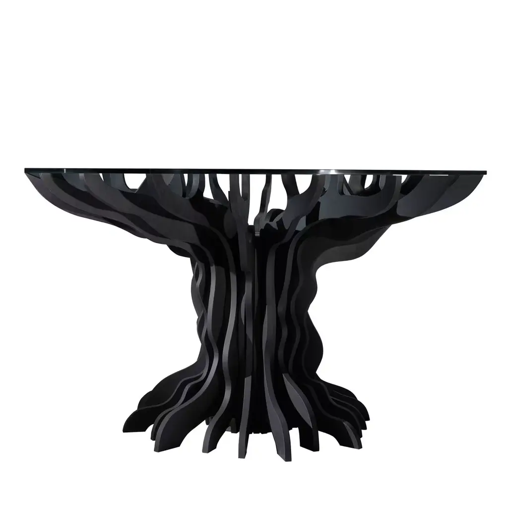 The exquisite design of this table is unlike any other. Its base is crafted from several pieces of birch wood arranged in a circular configuration allowing them to take on the organic shape of a grand tree. The round top, which the tree supports, is crafted entirely in tempered glass. The contrasting materials used create a subtle balance for a striking visual effect. This extraordinary piece of furniture serves both functional and decorative purposes.