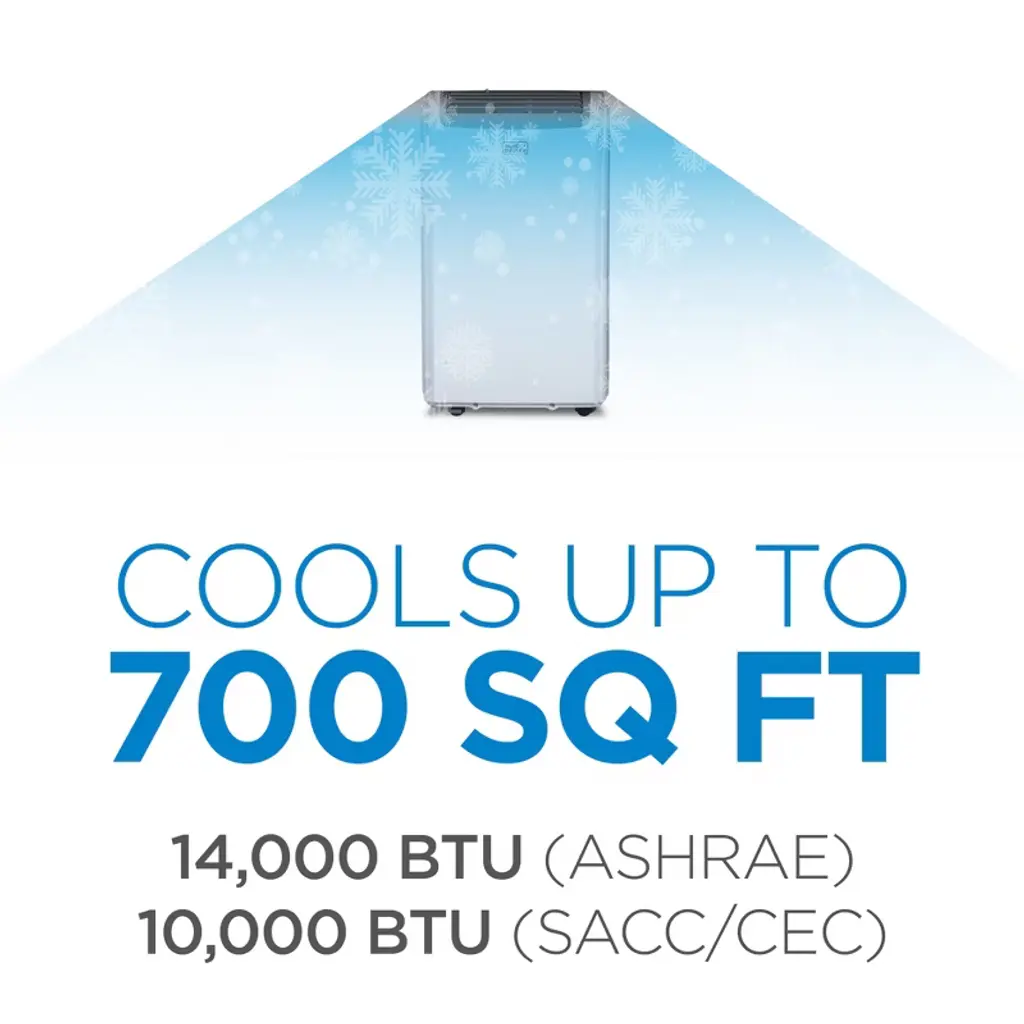 Enjoy a comfortable home climate with this versatile Black and Decker 14,000 BTU (10,000 BTU SACC) portable air conditioner unit. Cools the air down to 61 degrees Fahrenheit, dehumidifies up to 90 pints every 24 hours, and circulates air with 3 fan settings to stand up to summer heat in rooms up to 700 sq. ft. This Portable Air Conditioner features easy-to-use LED electronic controls and is quiet while you sleep, 53dB on highest setting. Window kit includes foam seal, slider bracket, 5.9 inch diameter air exhaust hose, hose inlet and outlet, 2 locking screws and drain hose. Works in double hung or sliding windows only, no crank windows. To minimize noise and vibration, the air conditioner should be placed on a firm floor. For safe and secure positioning, place the unit on a smooth, level floor strong enough to support the unit. Connect the duct and make sure it can function properly. Micro processor control delays the compressor from operating until 3 mins have passed. Thermostat range is from 61 degrees to 88 degrees Fahrenheit. Includes easy to use LCD remote control (2 AAA batteries required for remote - not included). 115V~/60Hz. 1340 Watts. Annual energy usage 900 Kwh. Start up amps: 65, working amps: 12. 3 prong grounded LCDI/Type B. ETL safety certified. 3 Cool Speeds (High 247 CFM, Medium 212 CFM & Low 170 CFM. ISTA-6A packaging ensures safe delivery.