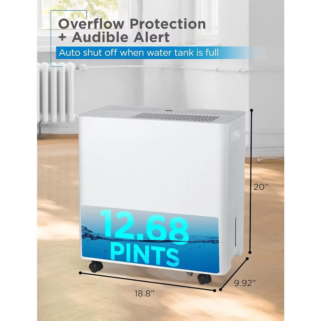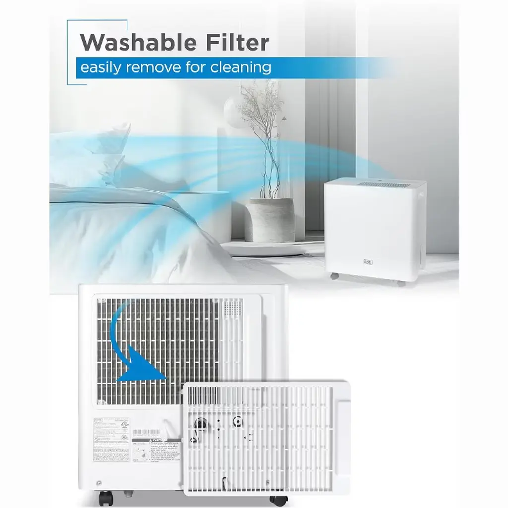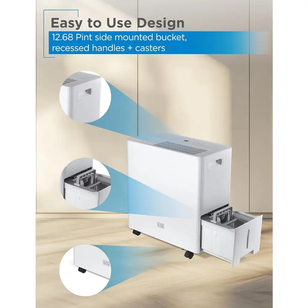 This high-quality BLACK+DECKER portable dehumidifier collects up to 50 pints of water in a 24-hour period and can cover up to 4500 sq. ft. 2012 DOE / 650 sq. ft. 2019 DOE standards. Enjoy cool, comfortable and refined air quality with this phenomenal dehumidifier, which operates in a temperature range of 41 - 90 Fahrenheit. Our dehumidifiers for basements also come with a removable tank with a capacity of 1.6 gallons/12.68 pints. Top mounted electronic control with water level indicator features an adjustable humidistat from 35 to 85% and an LED display. Dehumidifier with drain hose has auto restart & auto defrost functionality. This home dehumidifier comes with both a 1.64'L drain hose for continuous gravity feed drain & a 16'L hose for pump draining. Allows continuous run with pull out air filter access and washable, mesh filter. Room dehumidifier features a 24-hour timer, 2-speed fan, auto defrost and full bucket indicator light, audible alert system and automatic overflow shutoff protection. 115V/60Hz, 300 PSIG Low, 540 PSIG High, 4.6 Amps, 8.8 Running Amps, 545 Watts. ENERGY STAR certified and UL listed. 3-prong grounded plug. 5.29 oz. of R-32 Refrigerant. 1.85m power cord length. Drain hose 1.64 ft./0.31 in. diameter. 4 casters/rollers.