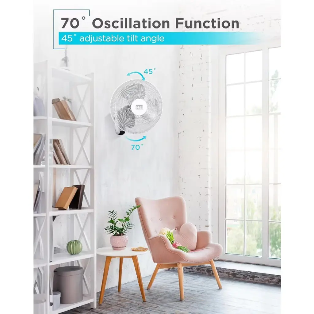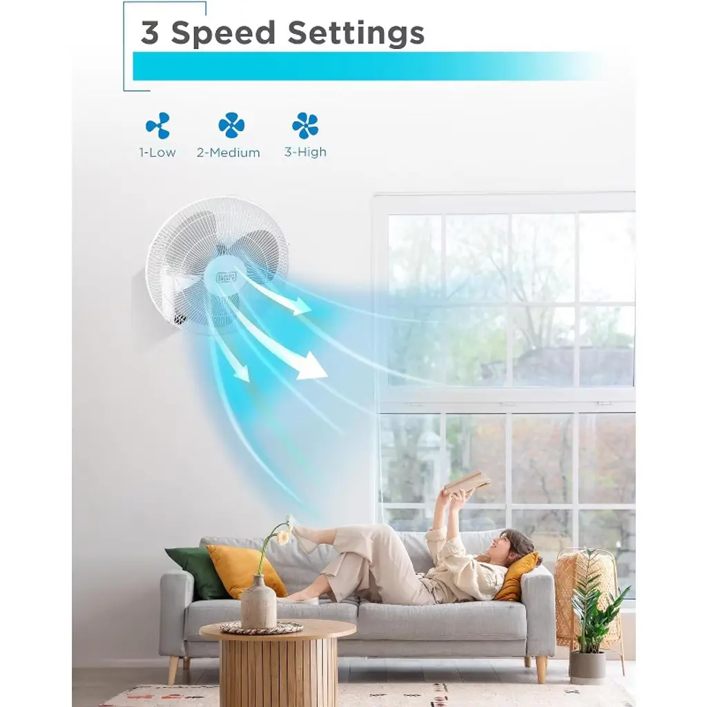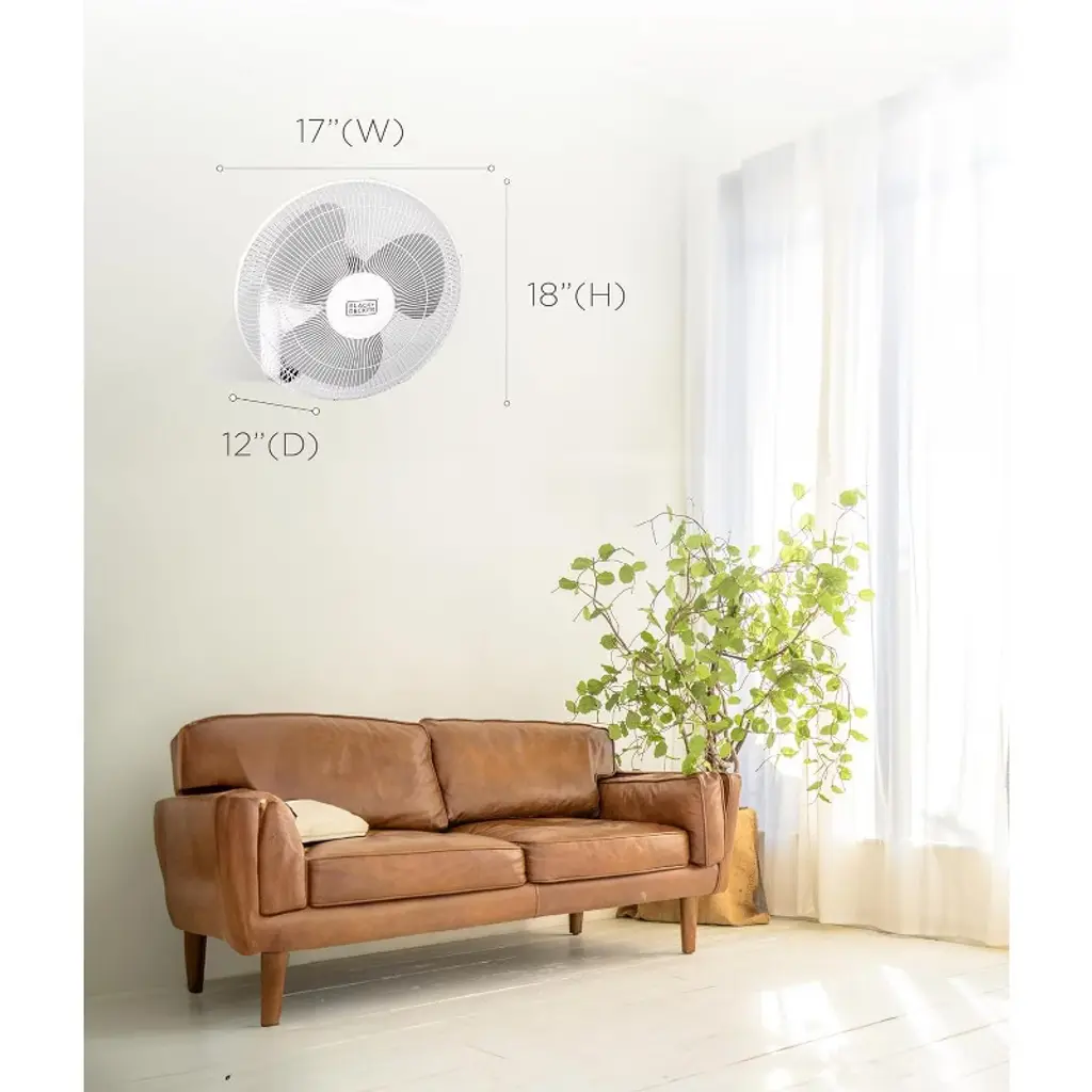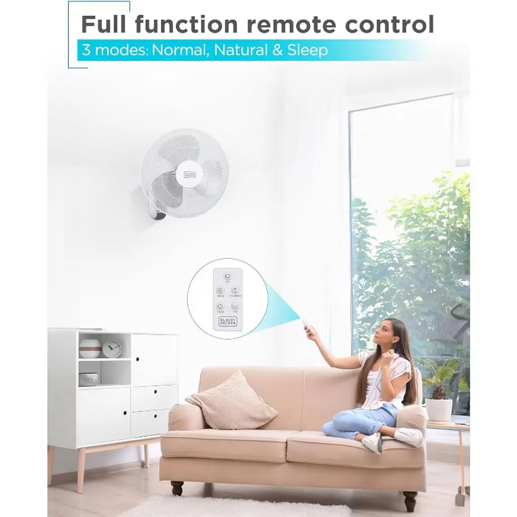 This BLACK+DECKER mounted wall fan creates high quality breezy circulation any time of day or night. Easily install with an included 3 screws and mounting plate in any room in your home -- whether it's the living room, bedroom, kitchen, basement or elsewhere. When it comes to top-quality fans for bedroom, ours is lightweight at 4.94 lbs. with unit dimensions of 17" x 12" x 18". Who doesn't love remote control convenience This room fan includes a fully functional fan remote control with LED indicator lights so you can program your settings and turn on and off at the press of a button. This cooling fan has 3 speed settings (Low, Medium & High) as well as 3 modes (Normal, Natural & Sleep). Our wall fan also includes a 70 Oscillation Function, 45 adjustable tilt angle, 7.5-hour shut off wall fan timer and 70" long power cord. The angle and oscillating versatility make this BLACK+DECKER wall mounted fan adaptable to various rooms while reducing cooling costs. Kick back and enjoy the breeze any time or day or night with our 16" wall mounted electric fan with remote control.