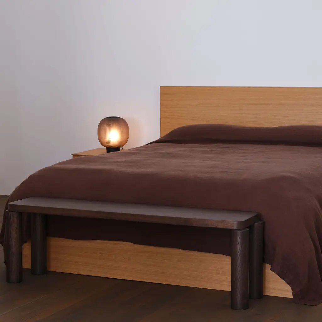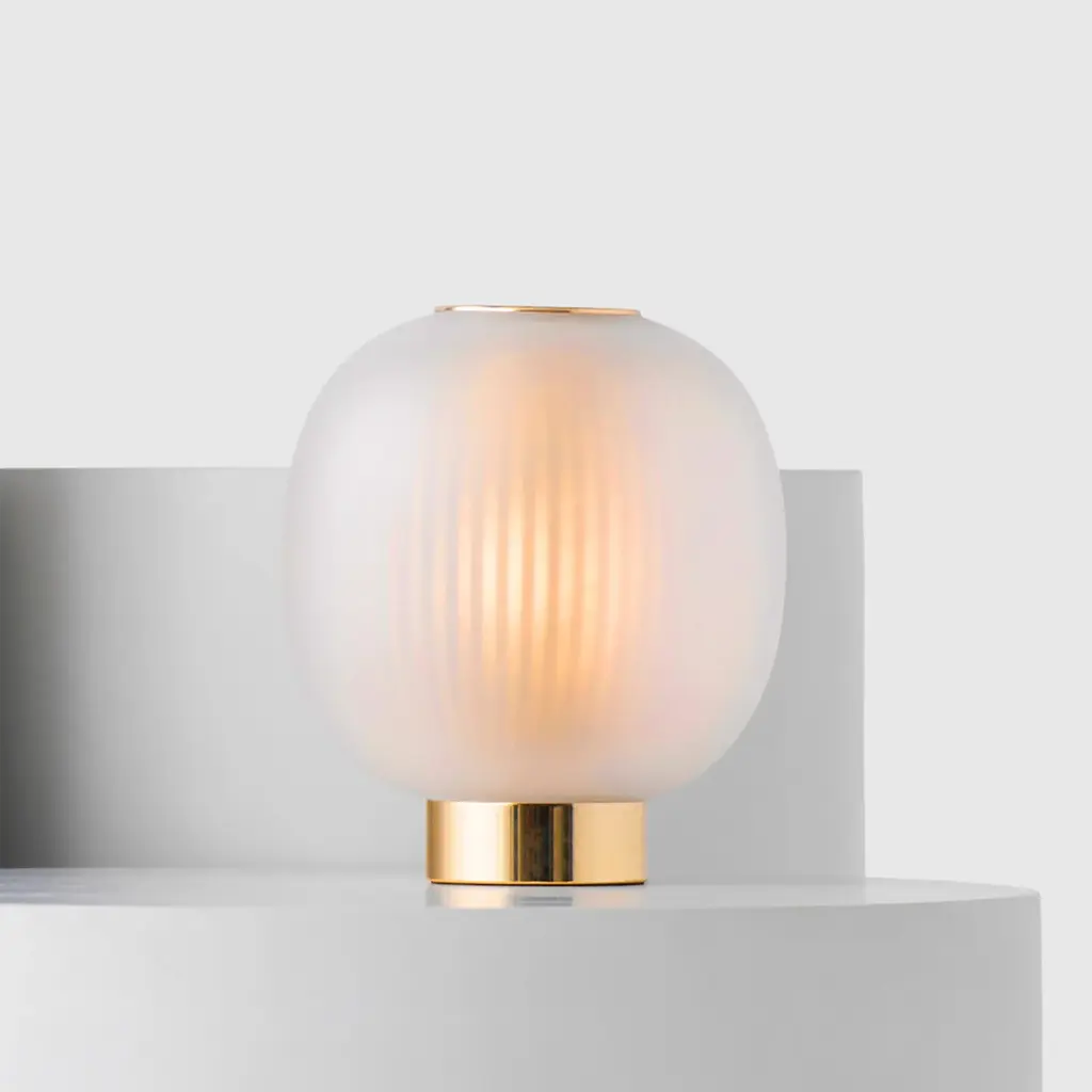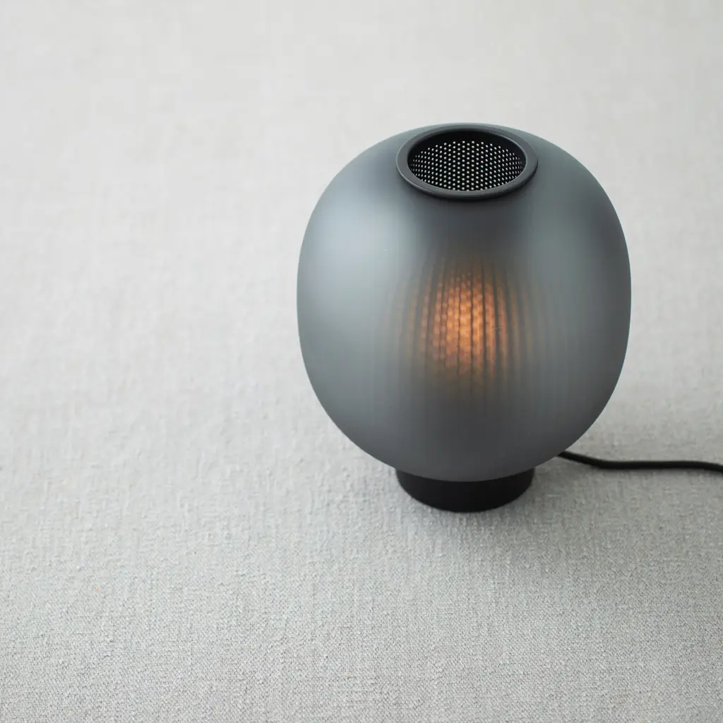 Instantly recognizable, Bloom's rounded form alludes to prosaic paper lanterns. Translated in frosted blown glass, the lamp's enveloping glow comes from light passing through a finely perforated mesh core and onto the inside of the ridged shade, creating a distinctive pattern. Projecting its warm hue upwards, it's a standout in a choice of black or white glass atop a plated stainless-steel base.