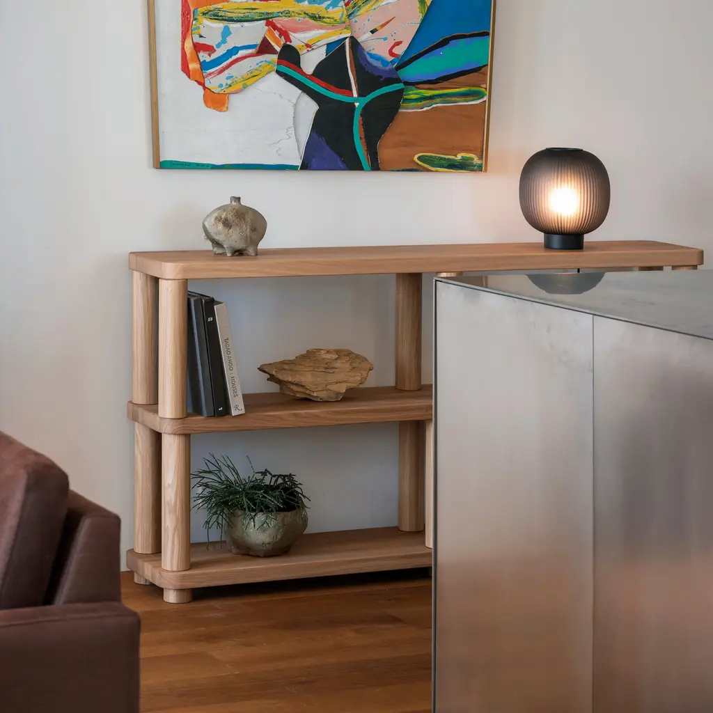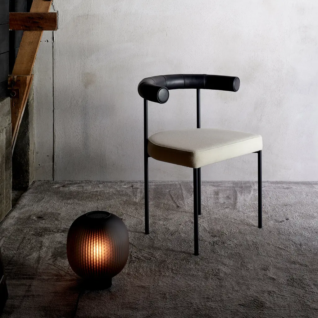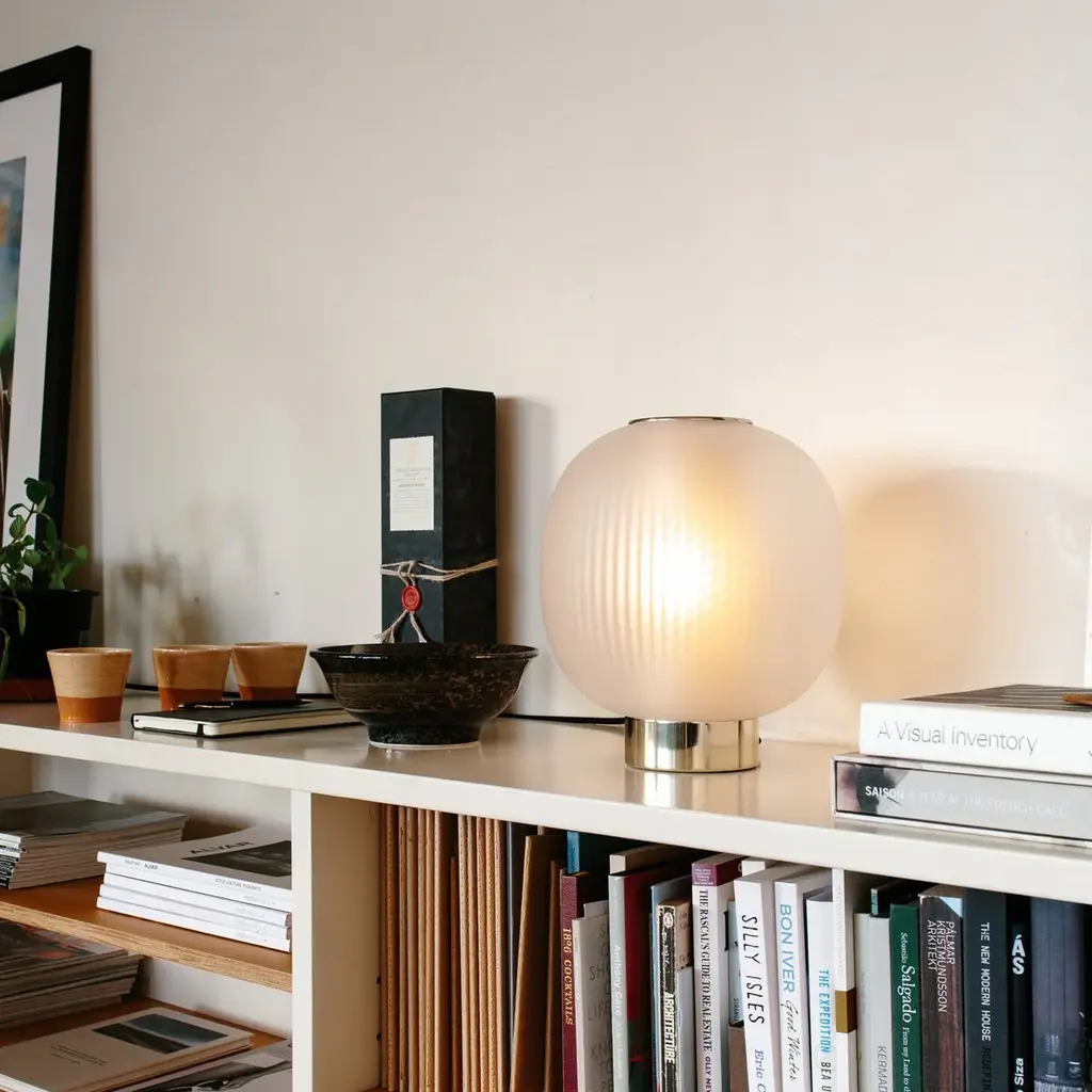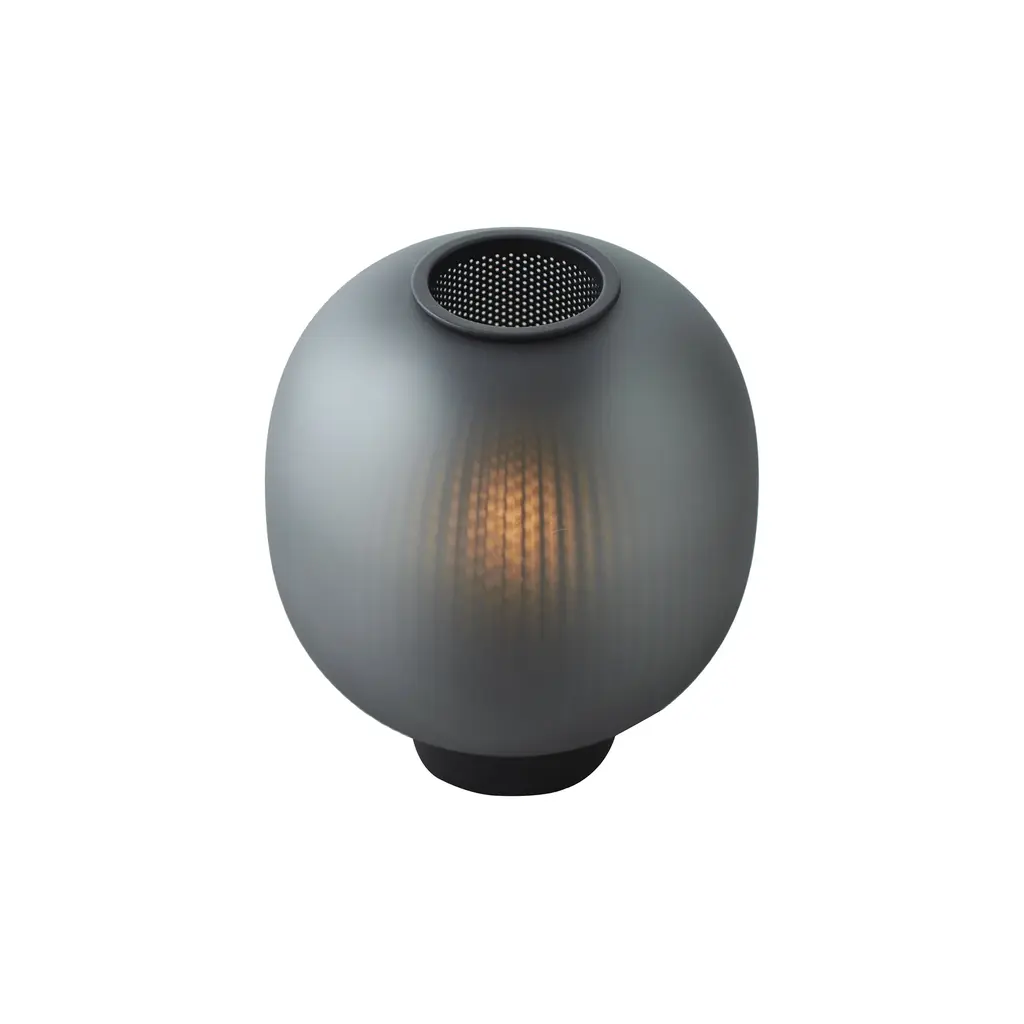 Instantly recognizable, Bloom's rounded form alludes to prosaic paper lanterns. Translated in frosted blown glass, the lamp's enveloping glow comes from light passing through a finely perforated mesh core and onto the inside of the ridged shade, creating a distinctive pattern. Projecting its warm hue upwards, it's a standout in a choice of black or white glass atop a plated stainless-steel base.