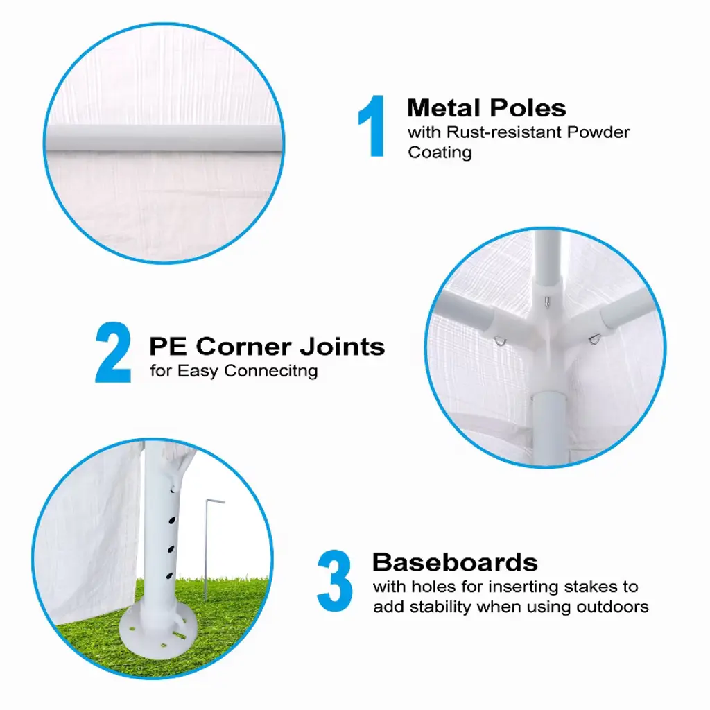 Description: Name: Party Tent Main Color: White Main Material: Polypropylene Packing list: 10x10 Party Tent x 1 Versatile and Spacious Outdoor Tent: Our 10x10 ft Wedding Tent offers ample coverage of 100 sq. ft., accommodating approximately 10 people for dining or partying. It provides a cool and shaded area for enjoyable outdoor gatherings. Convenient Detachable Sidewalls: The tent comes with 4 sidewalls featuring hook & loop fasteners for easy attaching and removal based on your preferences. 3 sidewalls feature clear church windows, allowing natural light and scenic views. Enhanced Stability: The tent's baseboard includes holes for secure staking on the lawn and can also be used with sandbags (sold separately) for added stability, ensuring a sturdy and dependable setup for outdoor events. Effortless Assembly and Storage: No tools are needed for simple assembly and disassembly. The lightweight tubes can be detached and conveniently stored in your vehicle trunk for easy transportation. Versatile Event Usage: Perfect for various occasions such as weddings, outdoor events, gatherings, baby showers, and camping trips, providing a versatile and practical solution for a wide range of events.