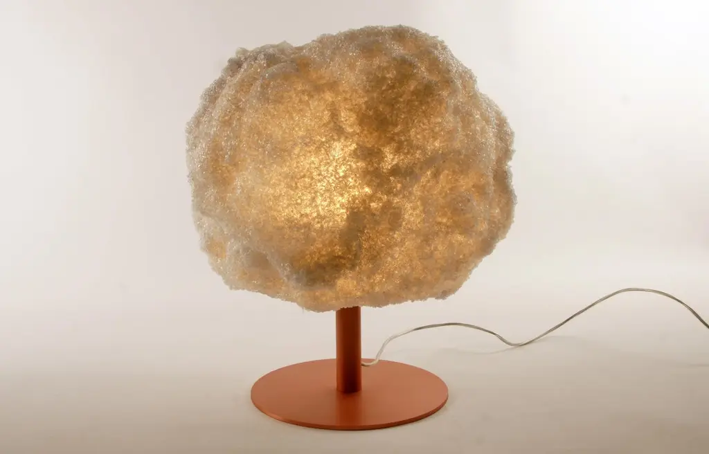 Blue storm table light copper by Johannes HemannMaterial: Polycarbonate, walnutDimensions: Ø 38 x H 45 cmThe Storm Series is by its concept the purest example of a process-design, where the designer seeks to set creative parameters to allow an object to shape itself, without any further direct involvement. The aim of this project is to create forms through storm winds. Johannes Hemann creates storm boxes, in which he releases storms from high pressure air . The storm is the base of the project: ‘the silence before the storm’. The ma- terial lies on the bottom of the box – ‘standstill’ – the air comes in, the storm begins and the energy is transferred from the wind to the material. ‘The wind stops’ - the form has been shaped and the silence after the storm sets in. The storm energy is then visible in the shape. Each piece is unique, as each generated storm finds different expressions.All our lamps can be wired according to each country. If sold to the USA it will be wired for the USA for instance.