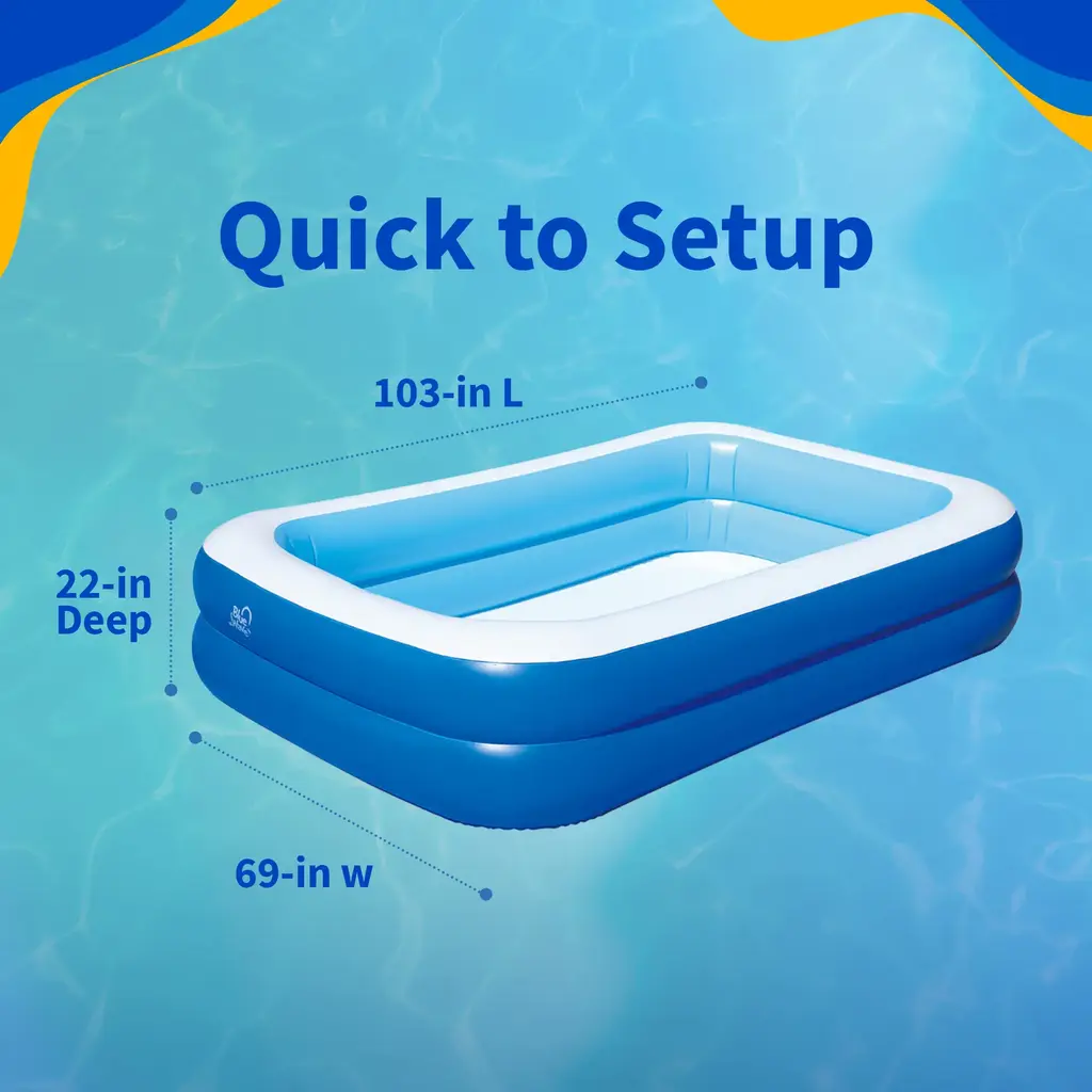 Have fun splashing, playing, and keeping cool all summer long with a Blue Wave Rectangular Inflatable Pool. Multiple air chambers, a double-valve intake, and free-flow exhaust valve allow for easy inflation and deflation. Crafted from durable, heavy-gauge PVC, this inflatable rectangular pool is certain to deliver many summers of fun and enjoyment for the whole family. Includes a matching cover.