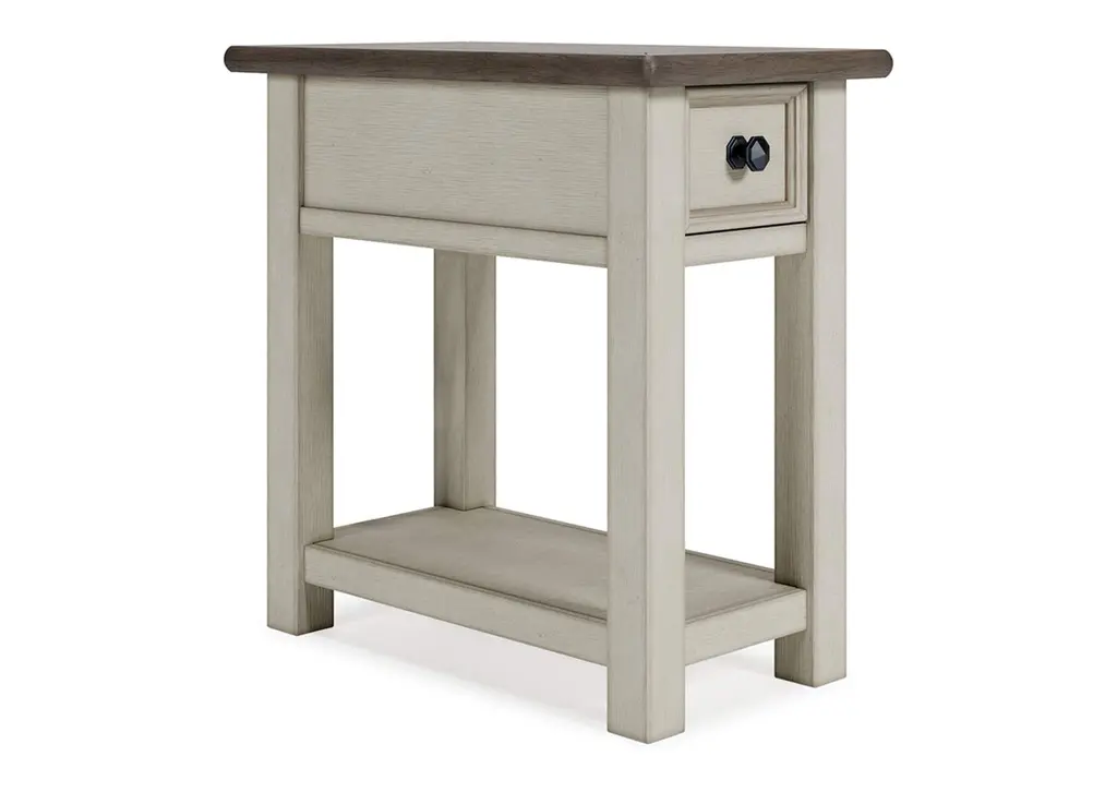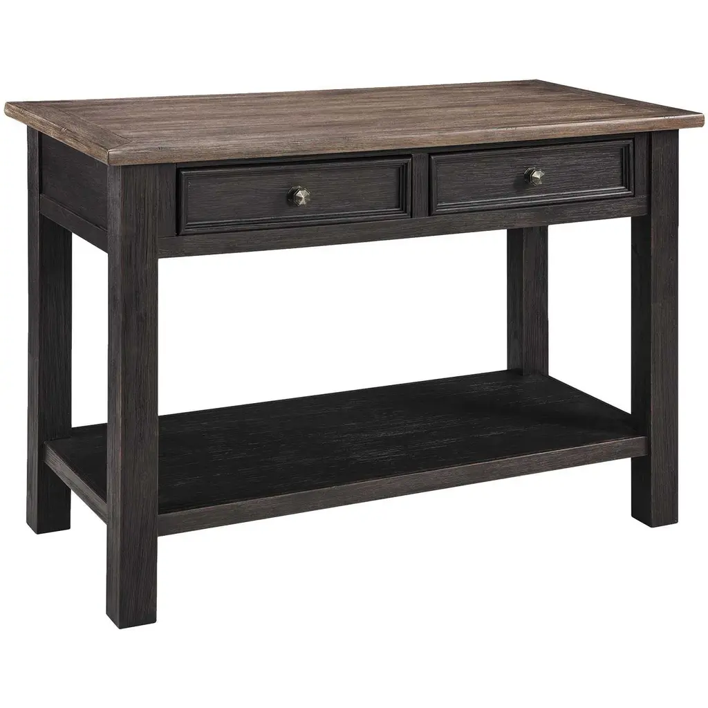 The Bolanburg console table complements your farmhouse, shabby chic or country cottage décor to perfection. This two-tone sofa table has a plank-and-frame style top, a gently distressed whitewash finish, and two smooth-gliding drawers with faceted black knobs. The lower shelf is a great place to showcase larges vases, dishes or collectibles. Crafted of select white oak veneers, wood and engineered wood.
