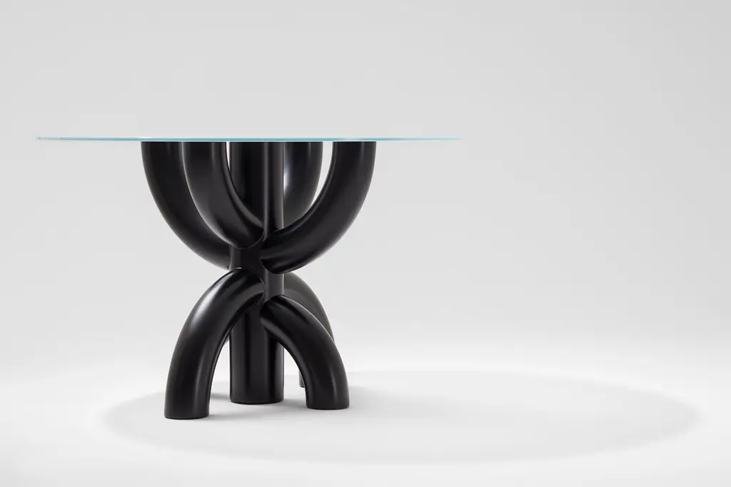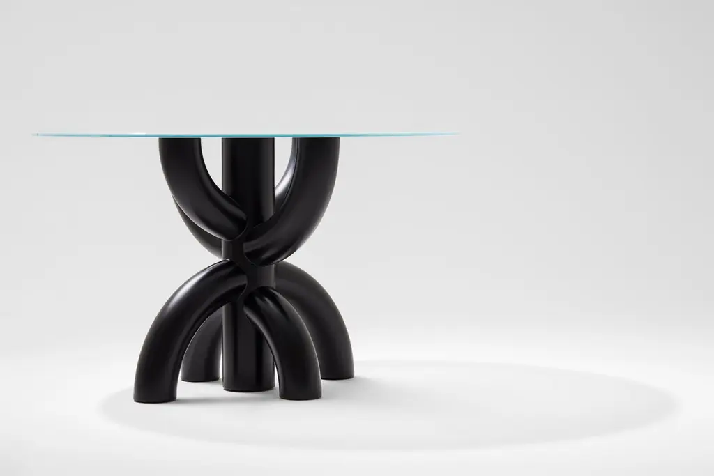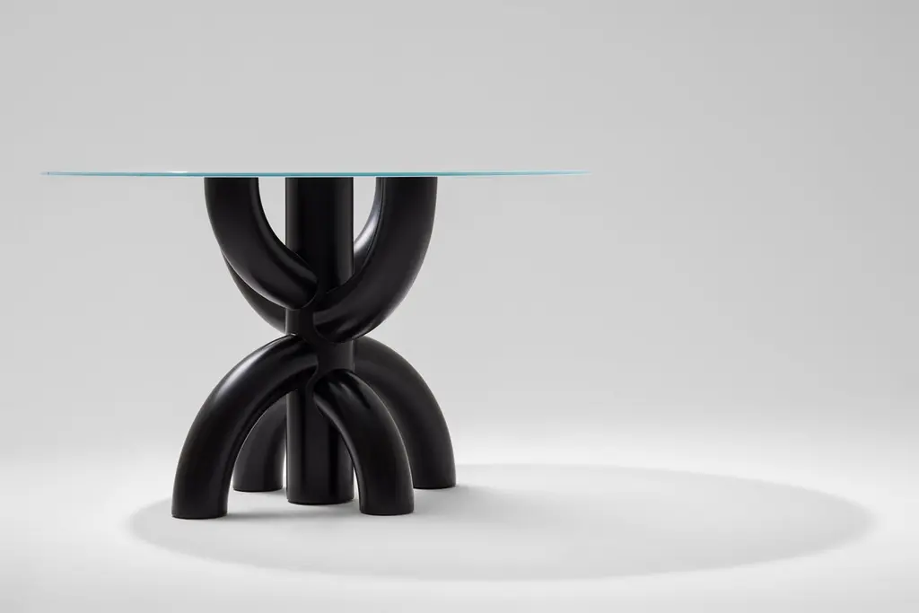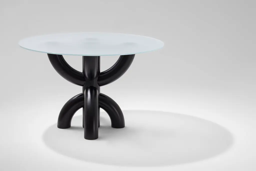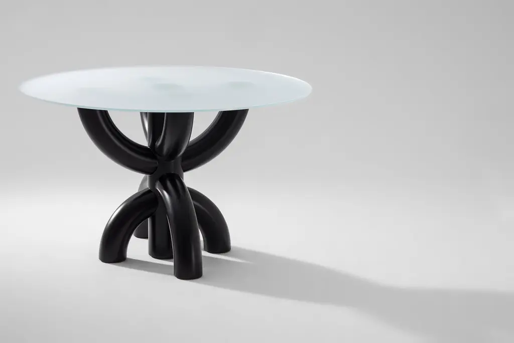 Bold table by Tolga SencerDimensions: 130 x 130 x 85 cmMaterials: black lacquer wood, satin glass over wood topIn Bold collection, bodies have strong symmetrical structures. Rotations of thick and broad elliptic lines on a single axis enriches the products with volume and dimensions. Integration of the rigid structure of the body with the fragile thin glass tray on top creates an impressive contrasting balance. When gazed from the top, whether semi distinct through satin glass or clear through black transparent glass, the body always has the spotlight. Movements of the arms slightly touching each other and intersecting at a single point may be the most exciting aspect of the products. The name “Bold” comes from the disruptive boldness of the curved forms.